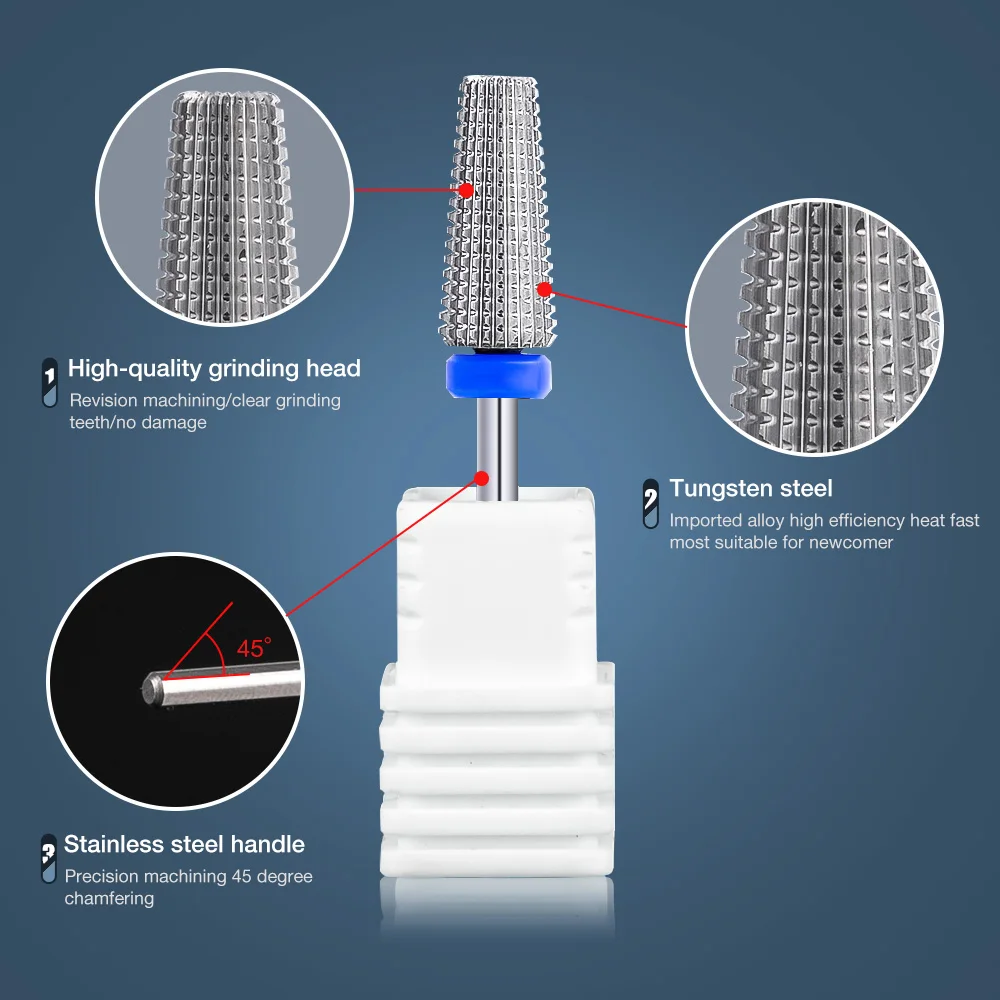 Твердосплавное вольфрамовое сверло для ногтей 5 в 1, сверло прямое конической формы для акрилового геля для ногтей, сверлильный станок с хвостовиком 332 дюйма