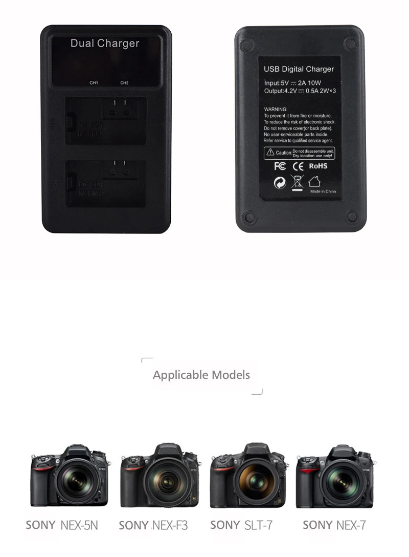 Совместимость с моделями: Sony nex-3, nex-3n, nex-5, nex-5n, nex-5r, nex-5t, nex-6, nex-7, nex-c3, nex-f3, slt-a33, slt-a35, slt -a37, slt-a55v, Cyber-shot dsc-rx10, Alpha 7, a7, a7rii, Alpha 7R, a7r, Alpha 7 s, a7s, a7sii Alpha a3000, Alpha a5000, Alpha a6000, A6300, a6500 DSC-RX10 комплектующие Фотоаппарата Sony DSC- RX10M3 DSC-RX10M2 ILCE-6300 ILCE-7SM2 ILCE-7RM2 ILCE 5000 ILCE 5100 ILCE-6000 ILCE-7 ILCE-7M2 ILCE-7R ILCE-7S цифровая камера и многое другое. В комплект входит: 2 x np-fw50 батареи 1 х USB двойное зарядное устройство 1 х USB кабель для зарядки 1 х Руководство Спецификация для зарядного устройства 1. Вход: 5 В/2 а постоянного тока (макс.) Выход: 8,4 V / 600ma (x2) 3. dimmension: 20x55x75мм 4. Вес: 45 г 5. ЖК-дисплей показывает уровень мощности нагрузки.