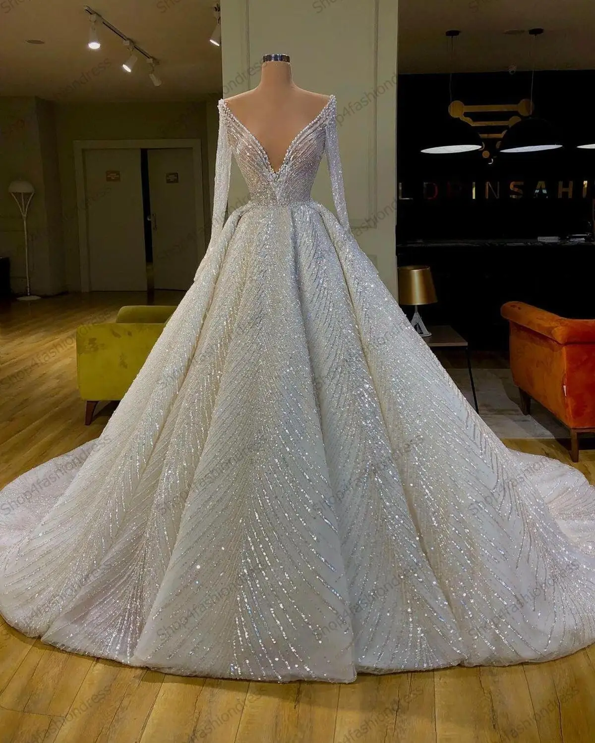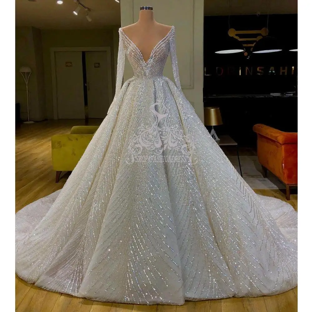 Блестящие кружевные свадебные платья с V-образным вырезом, роскошное женское платье с бисером, Арабская иллюзия, свадебное платье