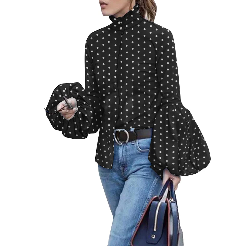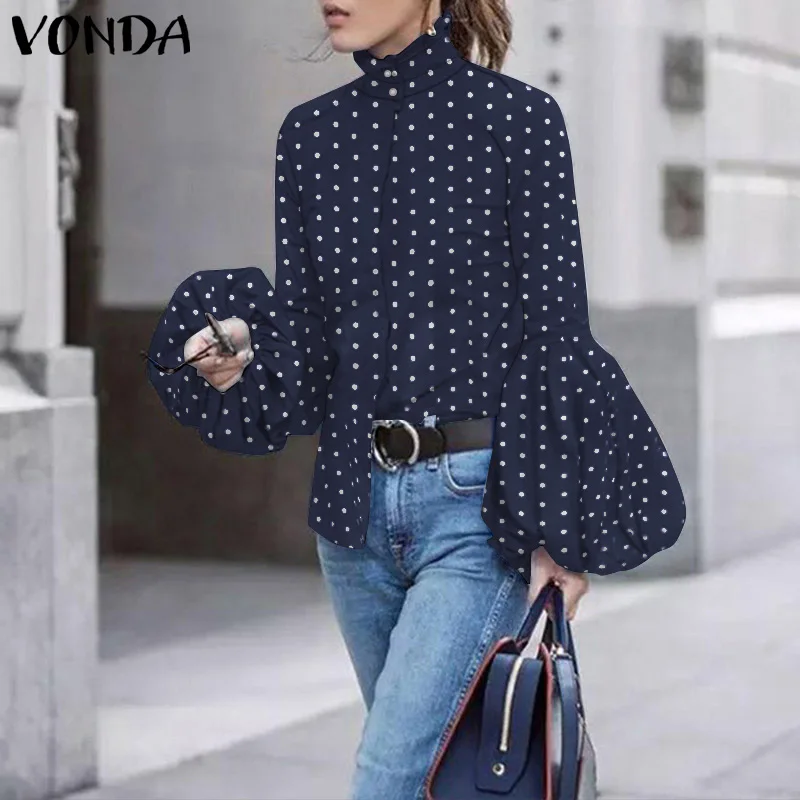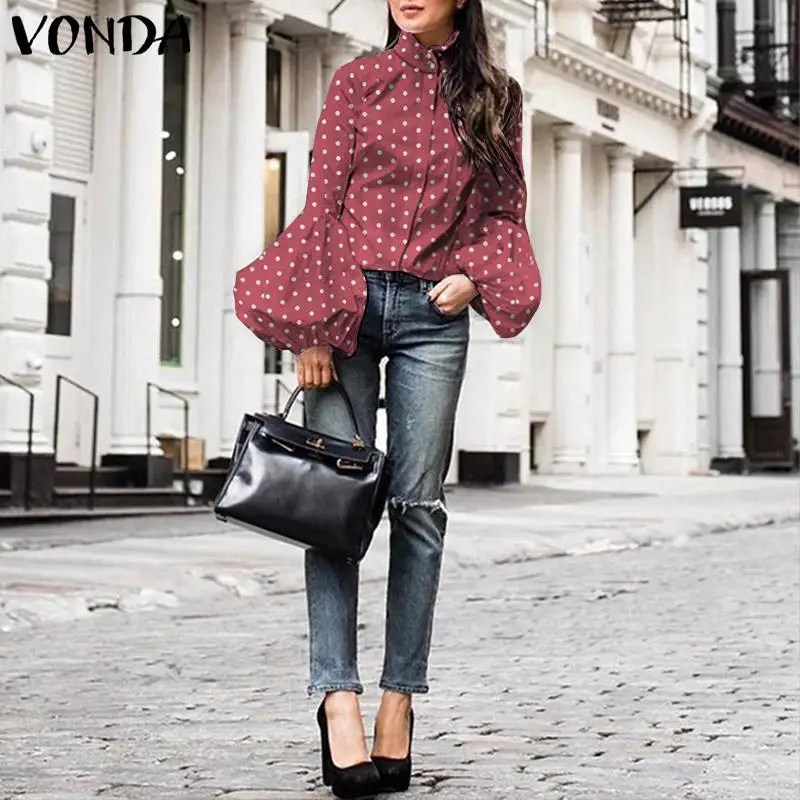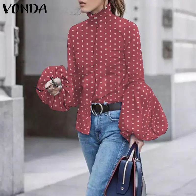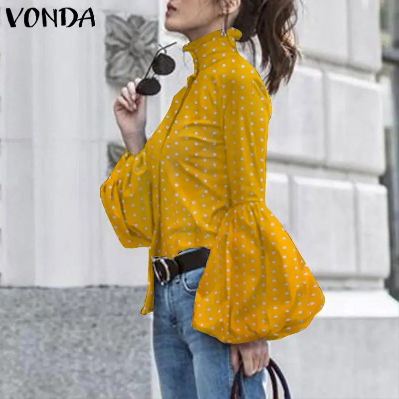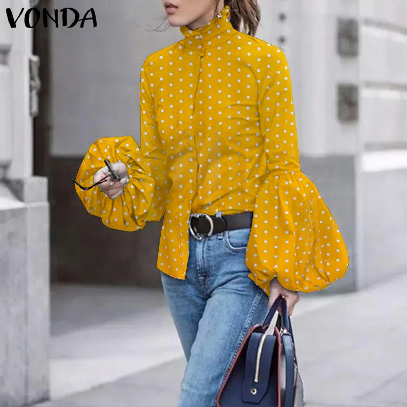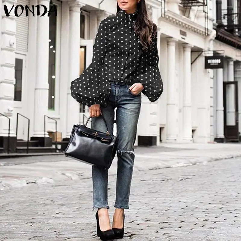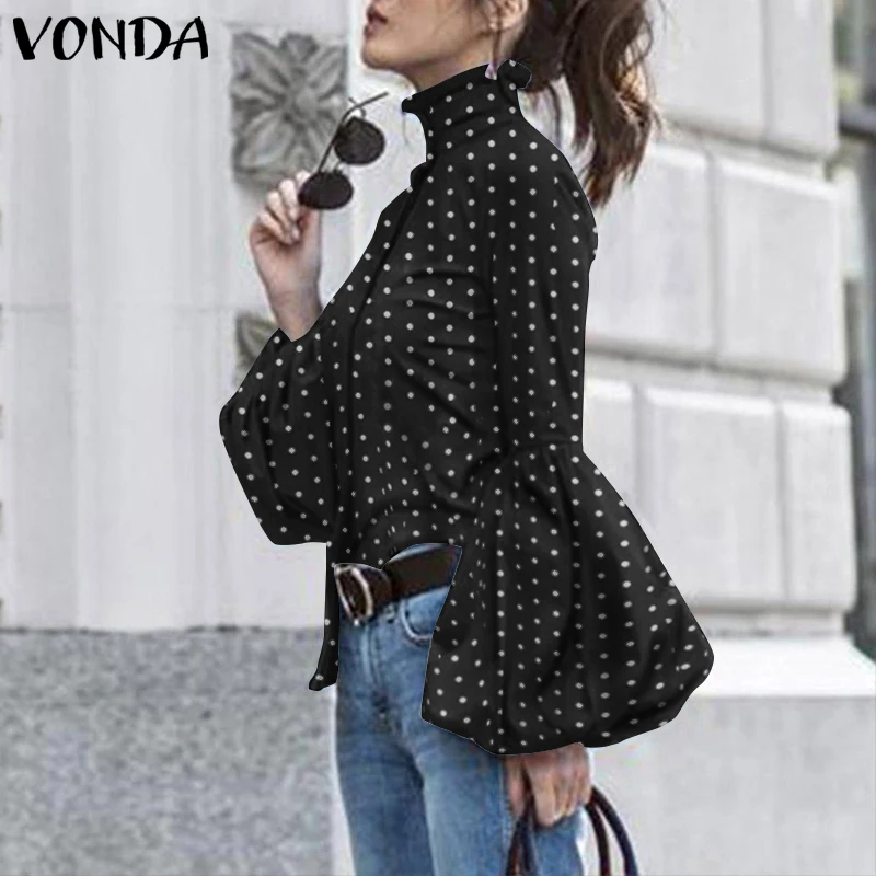 Женская блузка VONDA 2022, рубашки с отложным воротником, винтажные Топы в горошек с длинным рукавом, туники, блузы