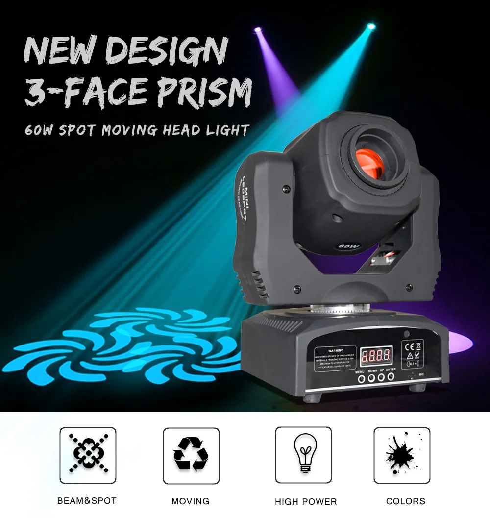 Сценический светильник, Подвижная головка 60 Вт, LED точечный светильник DMX, 512, с Лира, гобо и цветами, 3-гранная призма, подходит для дискотек, вечеринок