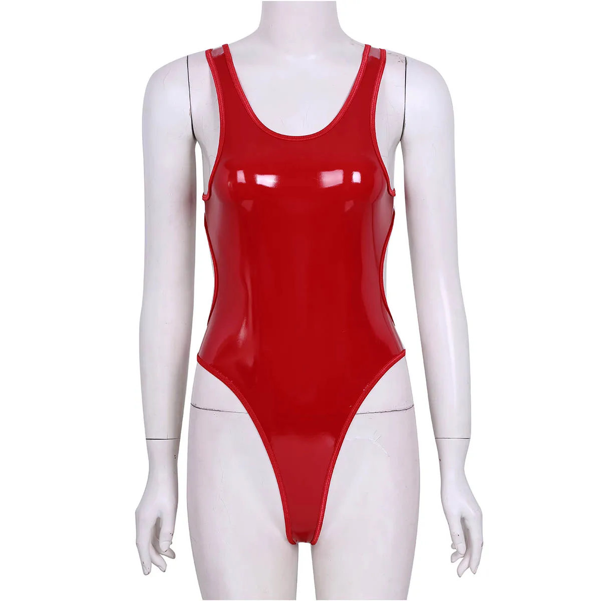 Соблазнительные Комбинезоны для женщин, Цельный купальник из искусственной кожи для взрослых, без рукавов, с открытой спиной, с высоким вырезом, стринги, трико, боди, Ночная одежда