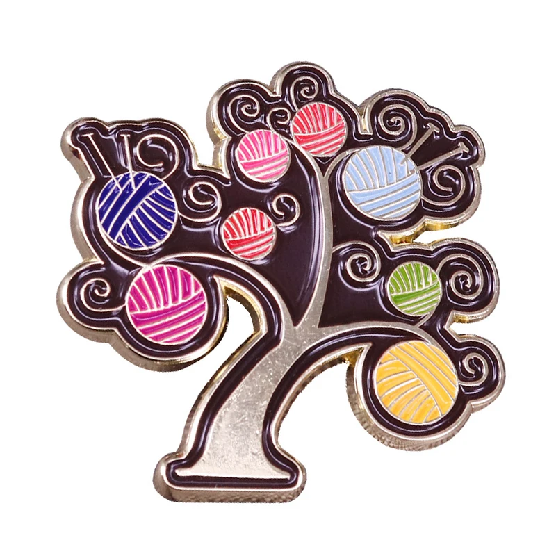 Эмалированная брошь в виде дерева с шариками из пряжи и спицами