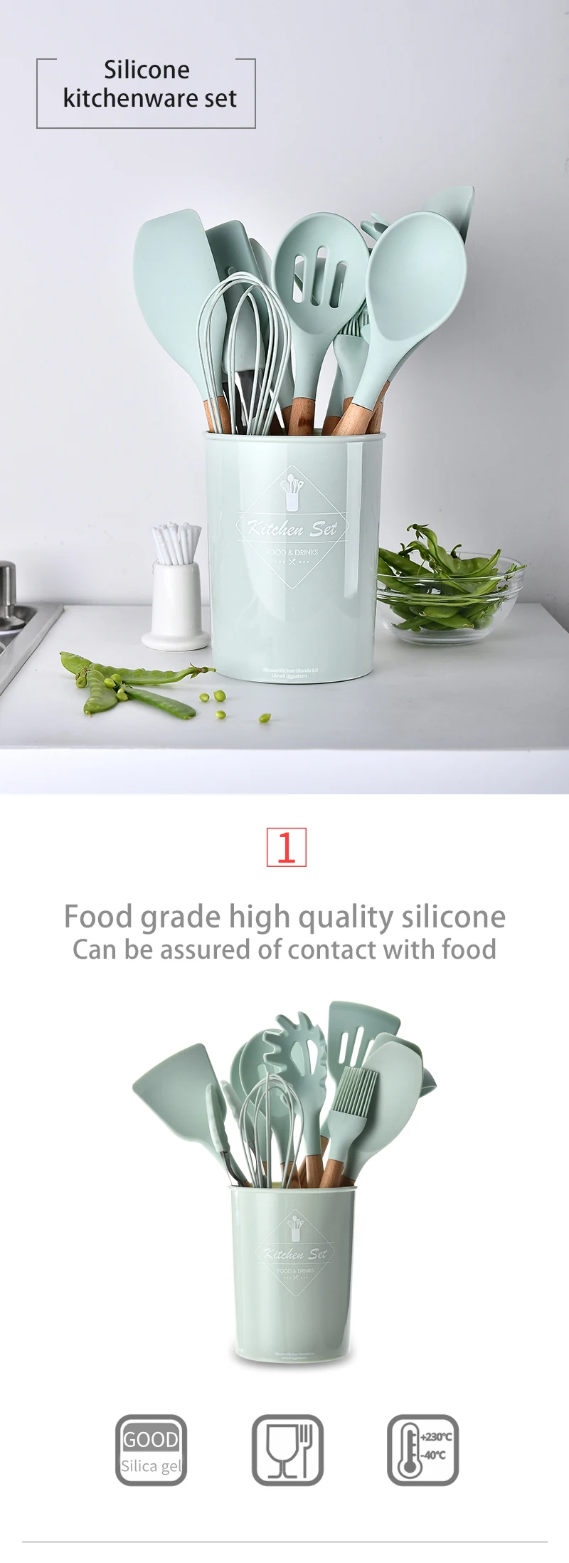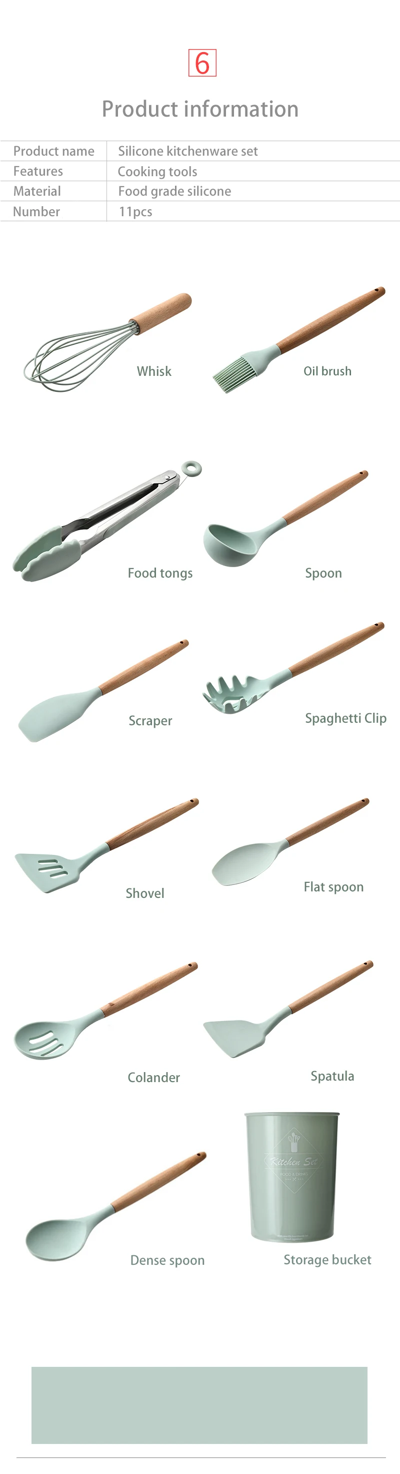 Набор силиконовых кухонных принадлежностей OLERD, 11 шт., набор кухонных инструментов, антипригарная лопатка, деревянная ручка, ложка для супа с коробкой для хранения LS11p #