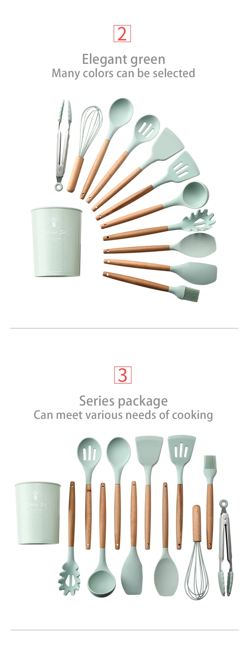 Зеленая силиконовая посуда, набор инструментов с деревянной многофу...