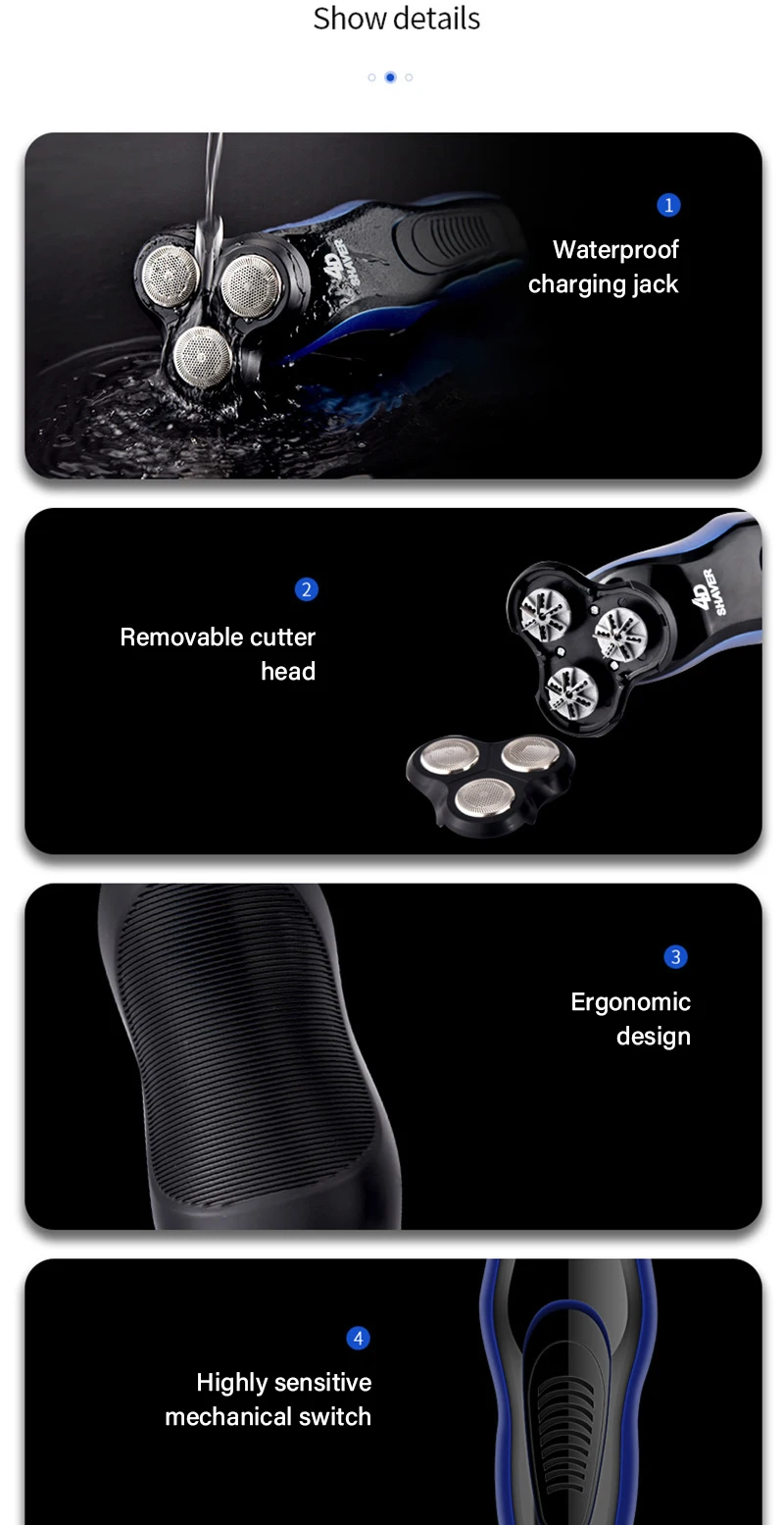 Информация о продукте Удобная конструкция кнопки переключенияИндивидуально плавающийЭргономичная ручкаВлажная и сухая бритваИнтерфейс USBНапряжение: 5 ВтНапряжение: 110-240 ВВремя зарядки: 8 часовВремя работы: 60 минутУровень водонепроницаемости: IPX7Совет: режущая головка может быть открыта для легкой очистки рег.