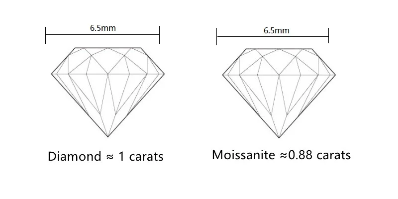 Поскольку моиссанит легче, чем алмаз с одинаковым размером, мы предпочитаем продавать моиссанит по размерам, но не по каратам. Кусочек 0,9 карат 6,5 мм механический полностью относится к ювелирным изделиям, который соответствует 1,0 карат алмазов. Вы обнаружите, что moissanite-это на 10% больше, чем вы ожидали, если вы покупаете moissanite в соответствии с каратами.