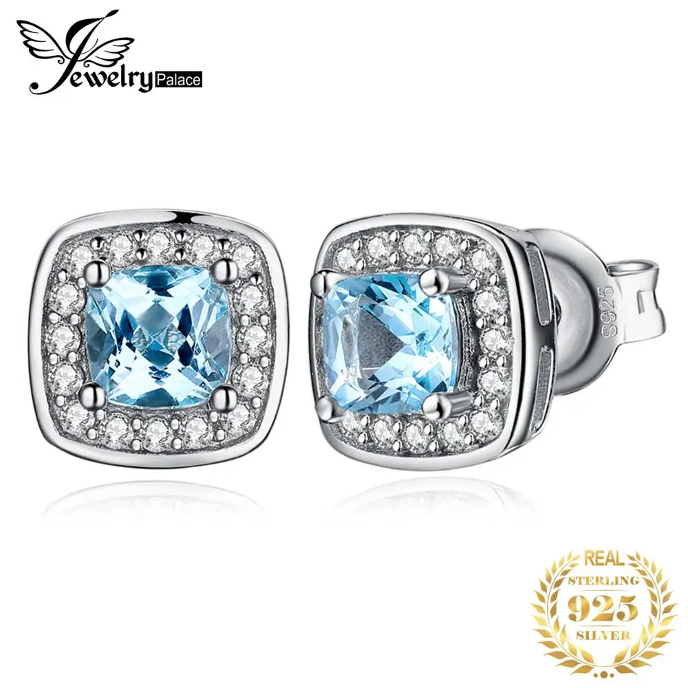 Женские серьги-гвоздики из серебра 925 пробы с натуральным голубым топазом