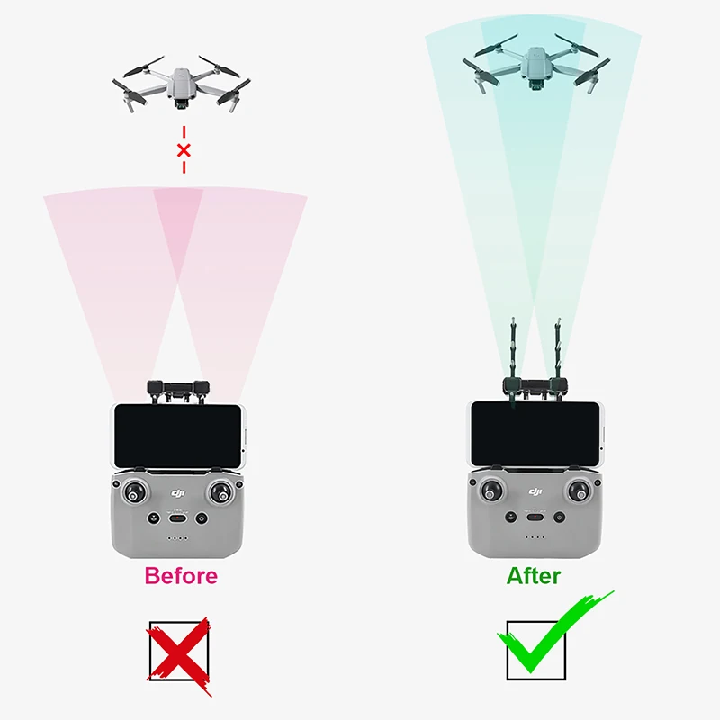 Легко устанавливается и разбирается, нет необходимости менять управление, подключать и использовать в любое время, неразрушающая конструкция установки, не беспокойтесь о повреждении пульта дистанционного управления.1. Выньте пульт дистанционного управления Mavic air 2 и разверните его.2. Антенна выровнена со слотом антенны дистанционного управления в сборе.3. Также с другой стороны, выровняйте антенну Yagi с нижним концом антенны дистанционного управления в сборе и пристегните с небольшой силой.4. Наконец, подключите телефон.