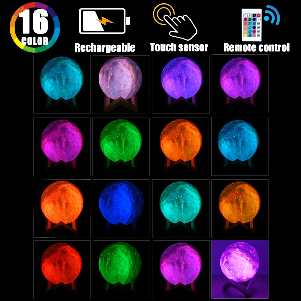 Светильник-Луна С 3D-принтом, 16 цветов, сенсорный и пульт дистанци...
