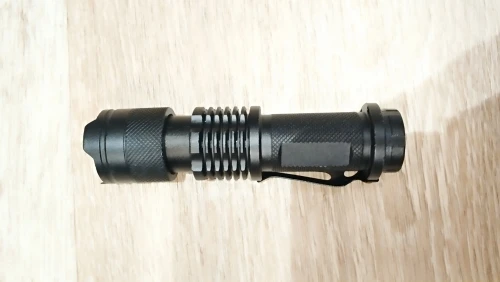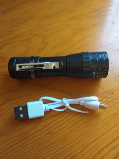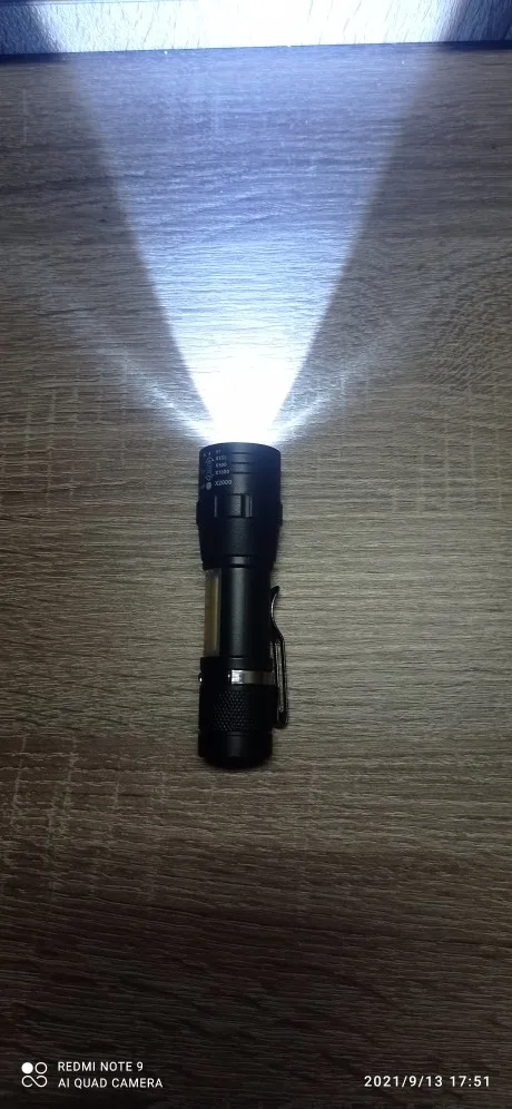 Пришел неделе через 3. Не плохо. Фонарик хороший за свои деньги. Светит ярко,далеко. Большой плюс то что на аккумуляторе. Корпус похоже пластмассовый. Клипса крепкая и плотная ,не слетит. В общем нормальный товар за свои деньги.