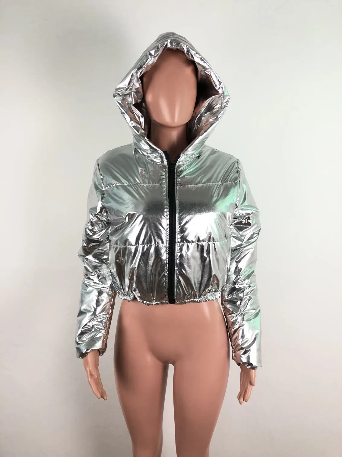 Светоотражающая Серебристая зимняя куртка из искусственной кожи для женщин 2020, теплый пуховик с капюшоном, Обрезанные парки с подкладкой, уличные пальто-пузырь