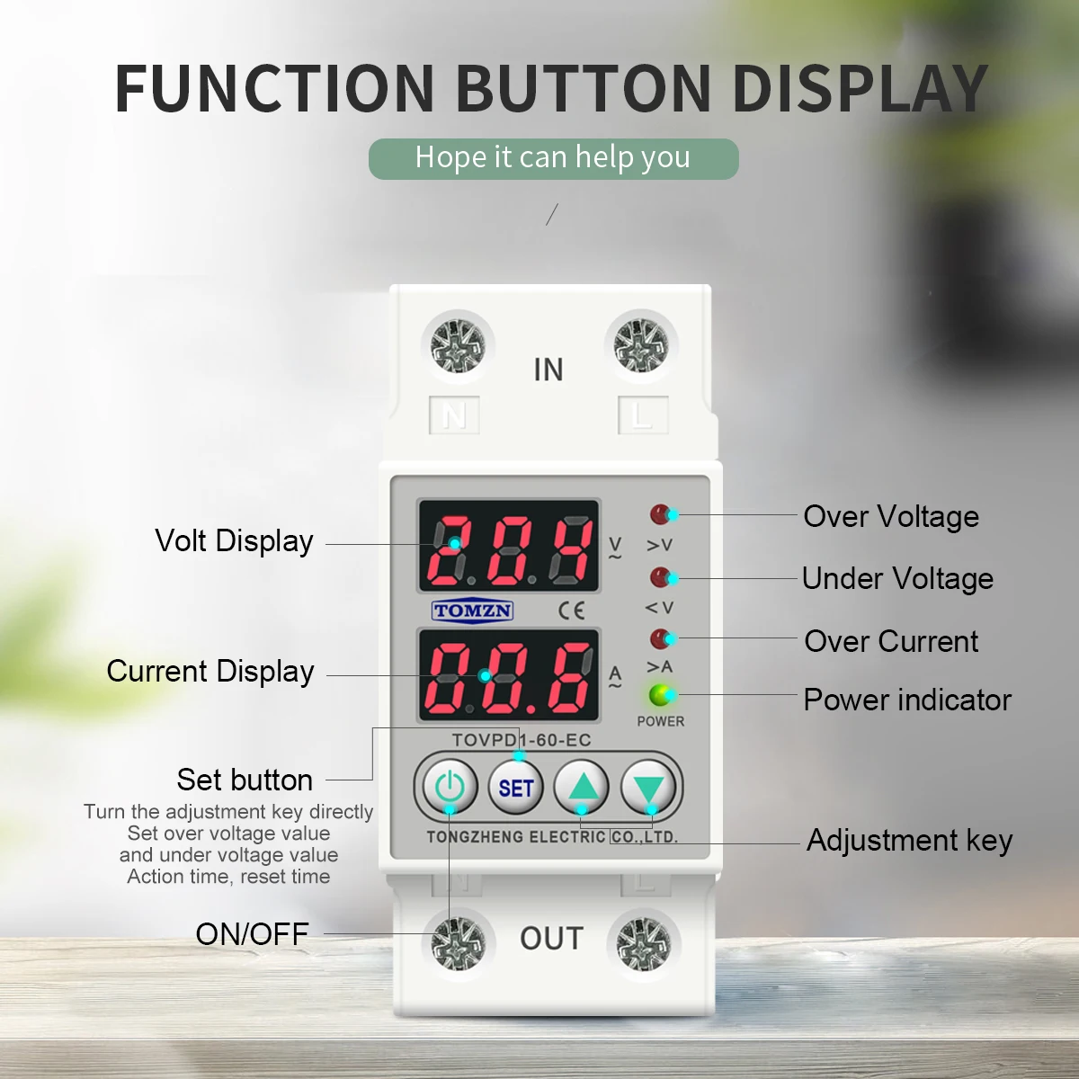 Din-рейка, 230 В, регулируемое повышенное и пониженное напряжение, реле защитное устройство предохранитель TOMZN TOVPD1-63-EC