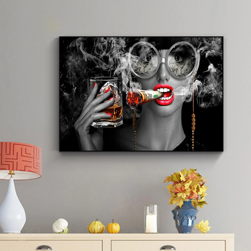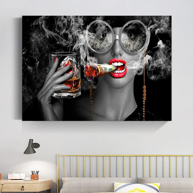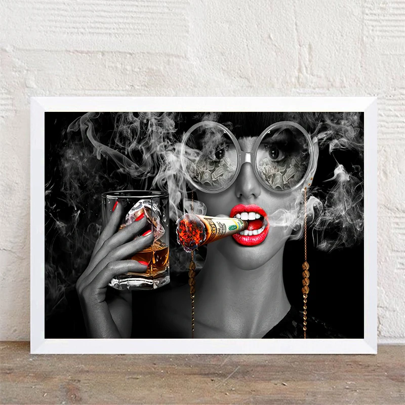 Художественная Мода девушка сжигает деньги и курит, Современная Абстрактная живопись, плакаты и принты для украшения гостиной