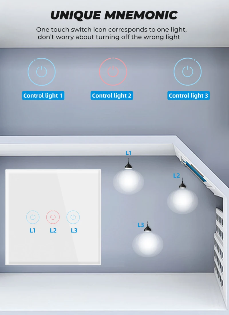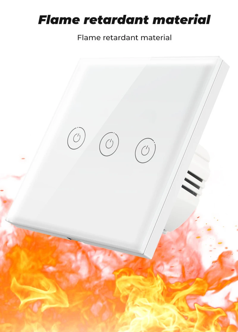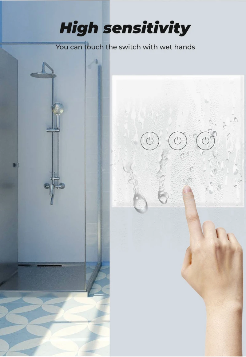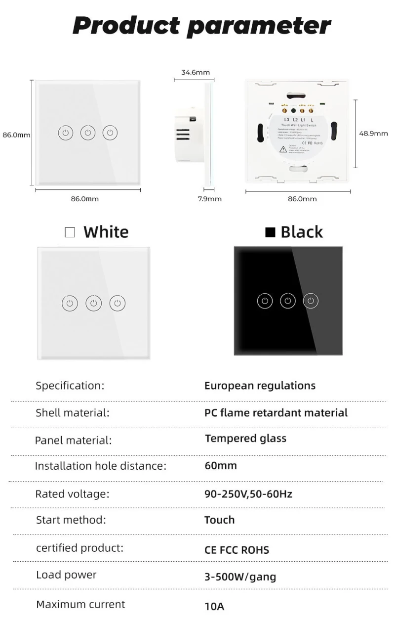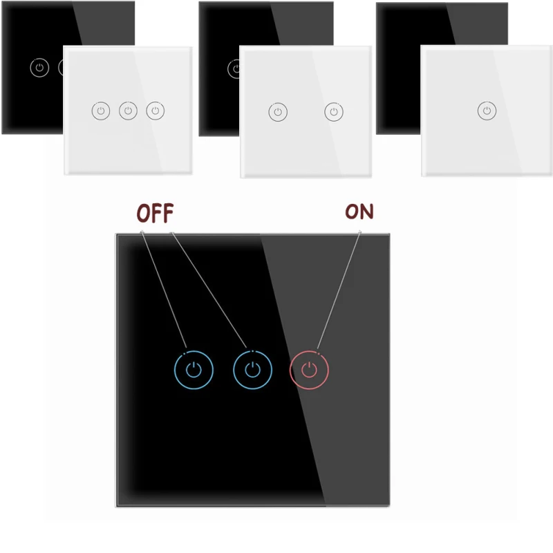 Переключатель Без нейтрального провода, одинарный Переключатель огня, стандарт ЕС, панель переключателей из закаленного стекла, настенный светильник, сенсорный переключатель, 3 комплекта, 1-позиционный сенсорный переключатель