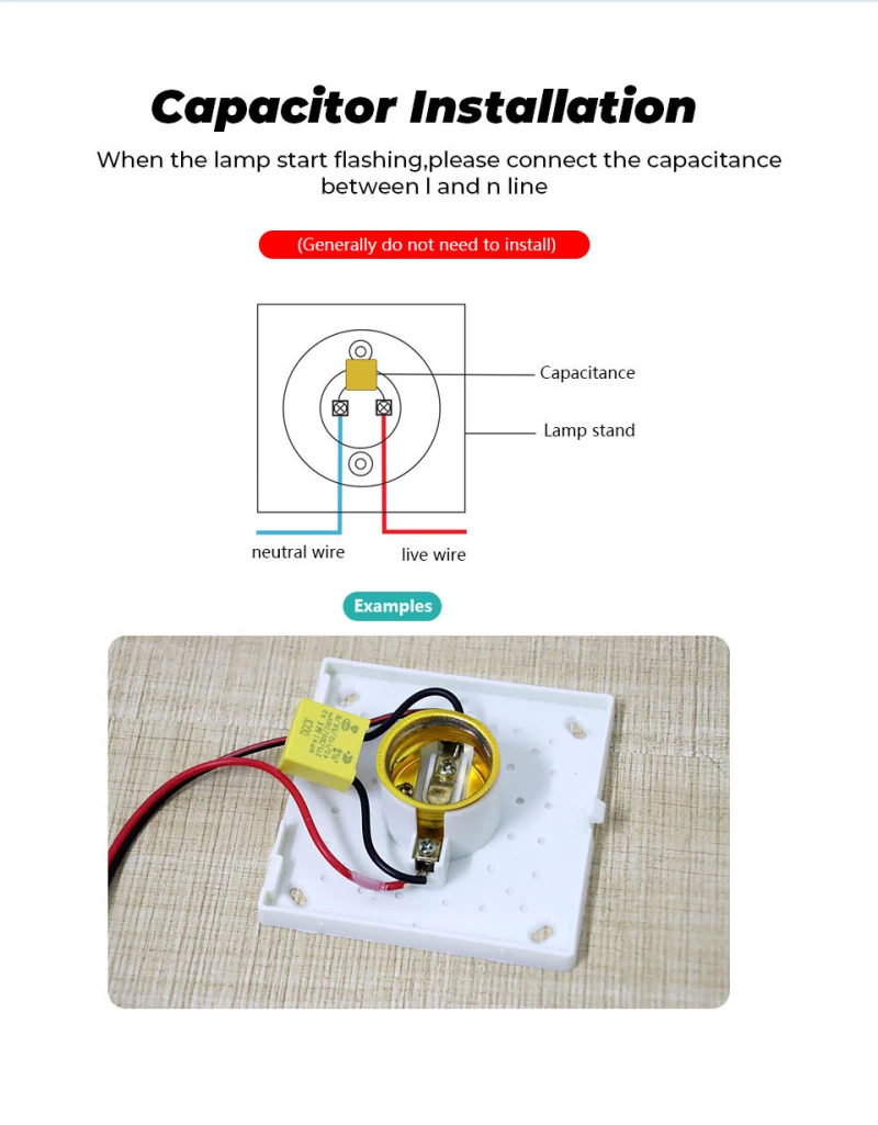 Нет необходимости в нейтральности. Когда лампа начинает мигать, подключите емкость между линиями l и n. (обычно установка не требуется)
