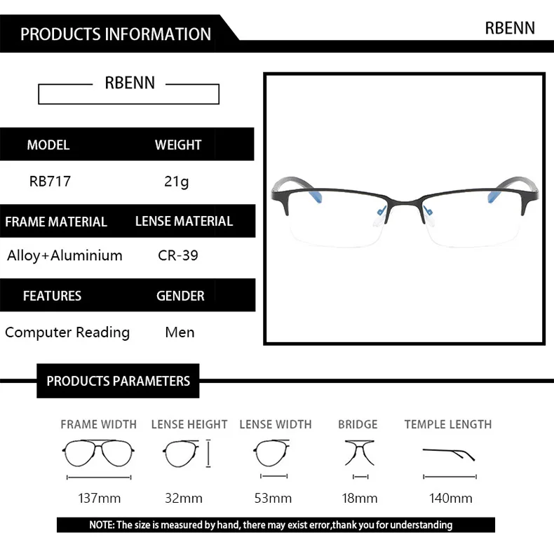 Мужские деловые очки RBENN в полуоправе с висками Alumiuium, ульсветильник кие оптические компьютерные очки с защитой от сисветильник