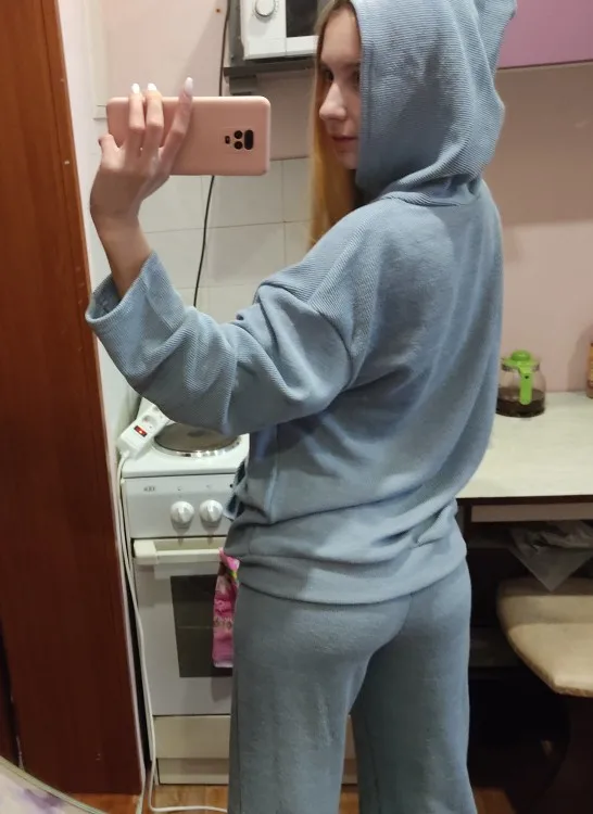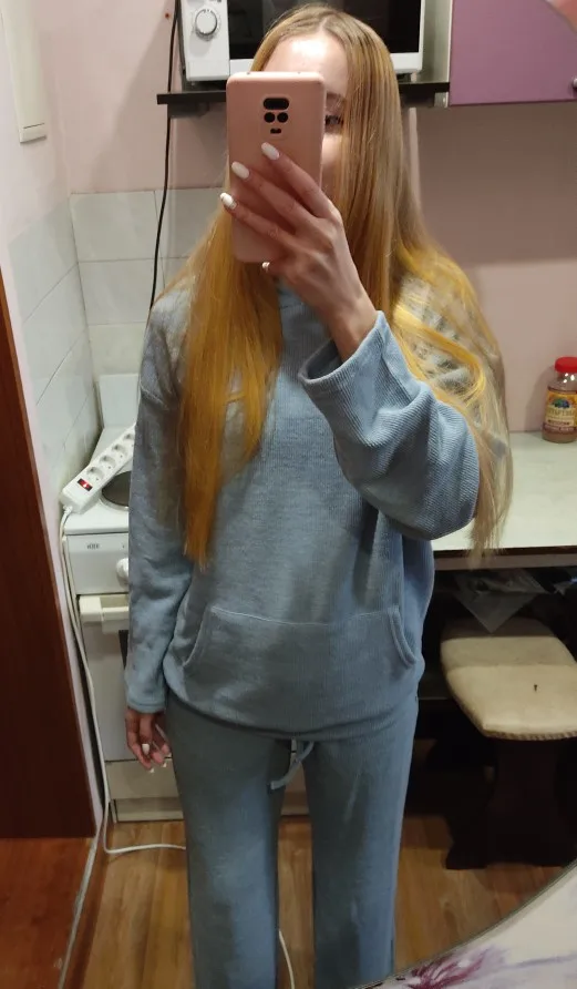 Ткань - имитация вязки, это не вязаный костюм, а сплошное полотно под вязку. Костюм приятный к телу, при росте 175 брюки чуть выше щиколотки. Смотрятся как кюлоты. В целом костюм хорошо сшит, объёма верха достаточно, свободно сел на беременном (7 месяц) животе. Брюки хорошо тянутся, резинка не давит, посадка брюк высокая. Продавец все отправил на следующий день после заказа, заказ пришёл в Казань (Татарстан) за неделю.