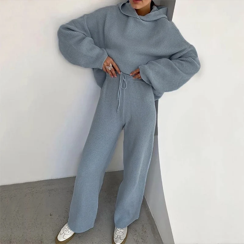 Женский трикотажный костюм с капюшоном, однотонный повседневный комплект из 2 предметов, Свободный свитшот с длинными рукавами и широкие штаны с эластичным поясом, весна 2021