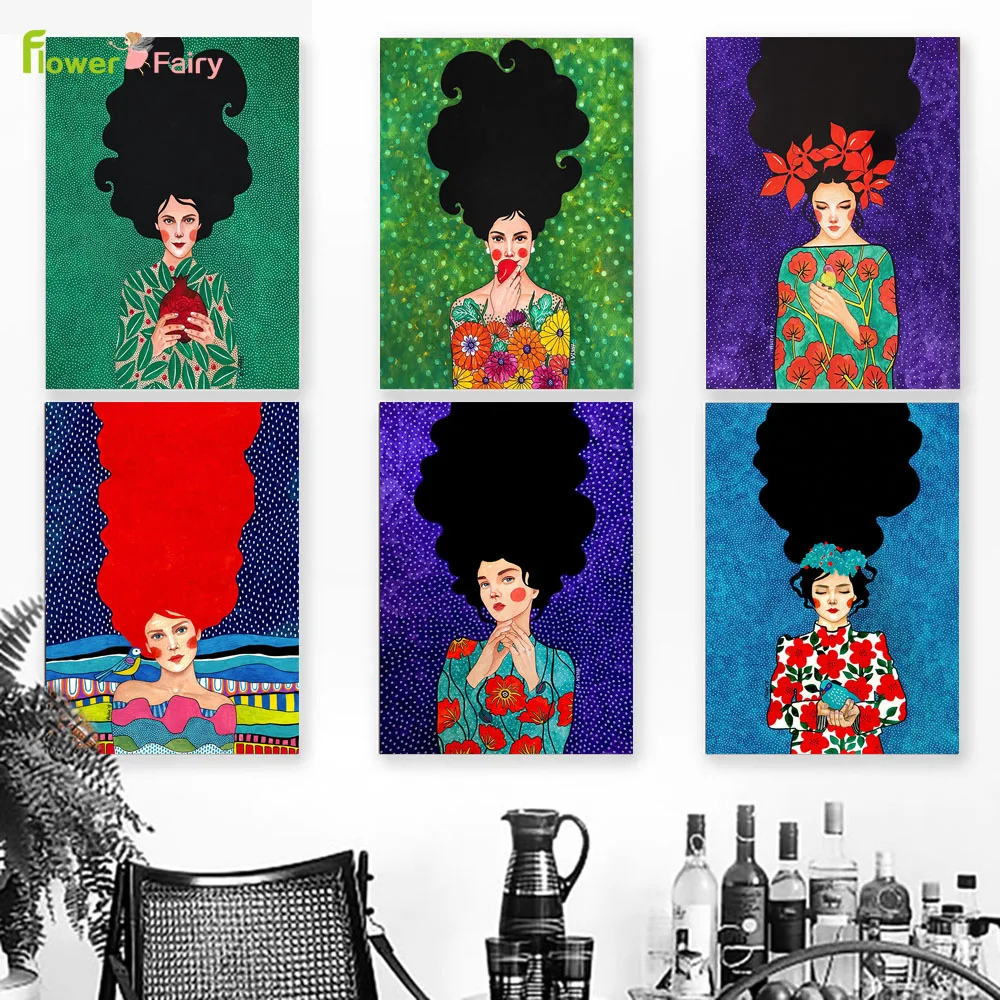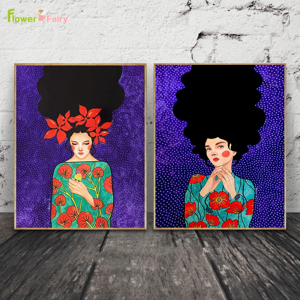 Красочные волосы девушка цветок современная женщина настенная Карти...