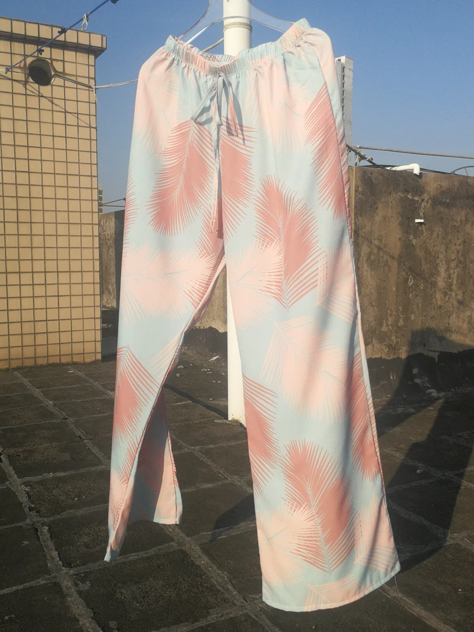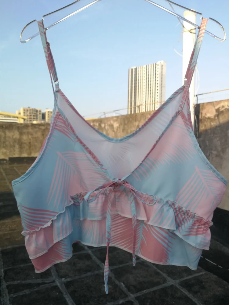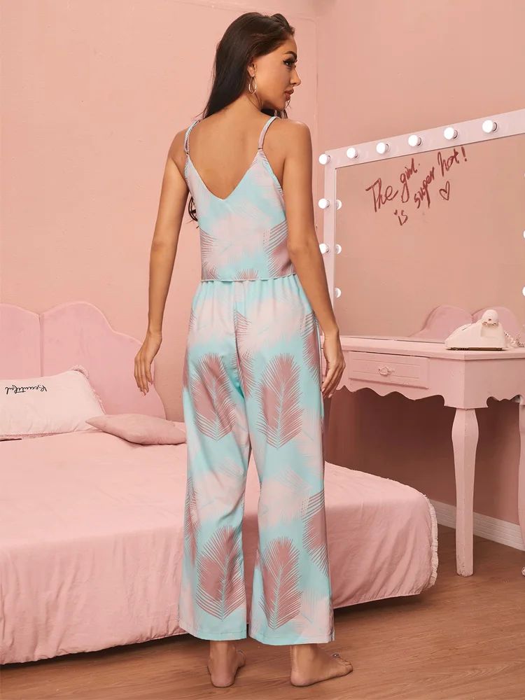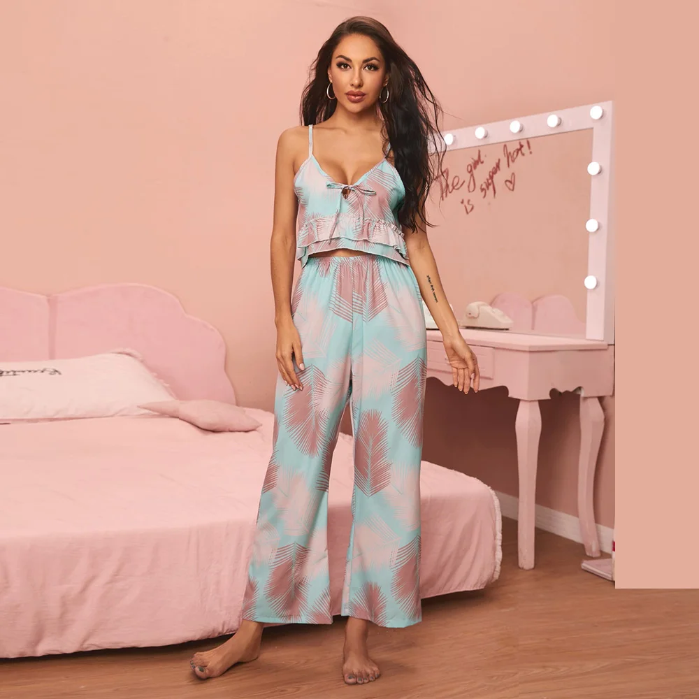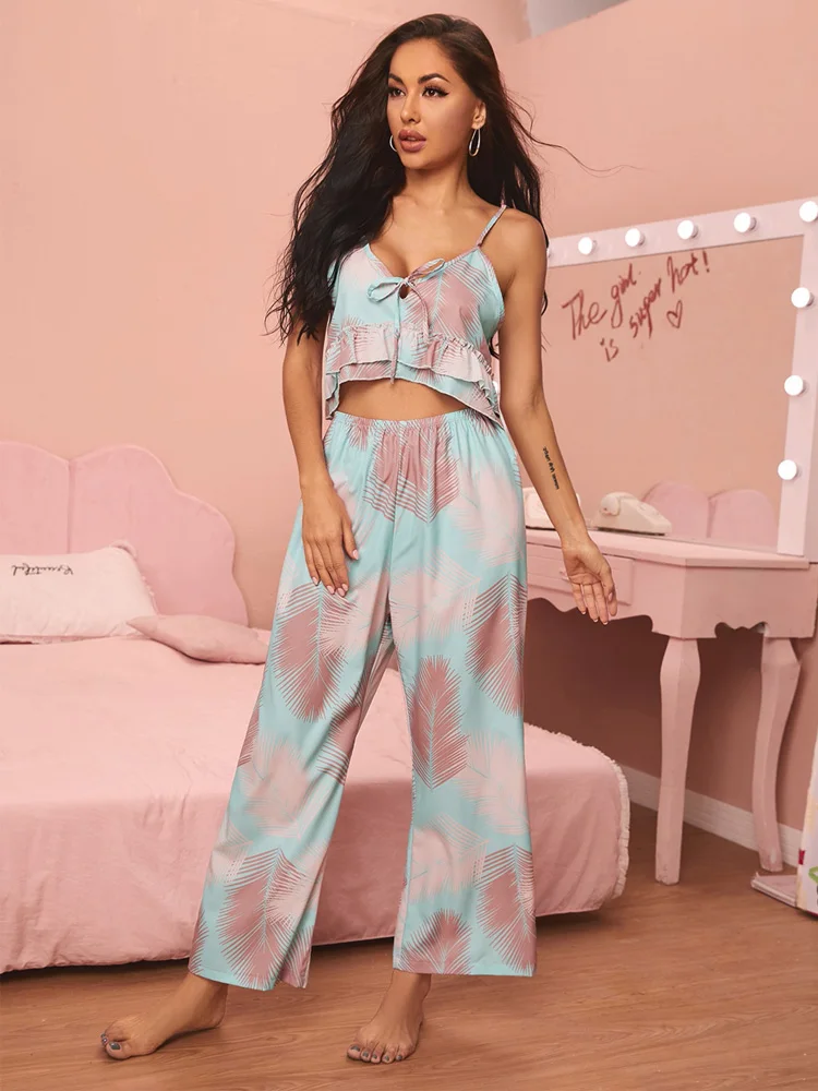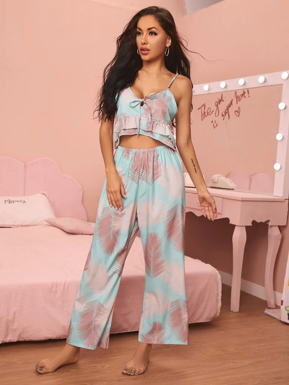 Пижамный комплект с тропическим принтом, Атласный топ на бретелях с оборками и штаны, одежда для сна с завязкой спереди, мягкий домашний костюм