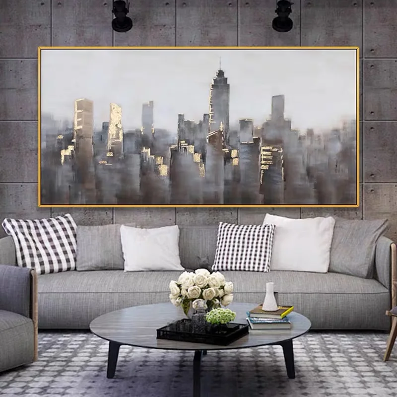 Золотая городская пейзаж, настенная живопись, ручная роспись, современная абстрактная масляная живопись на холсте, картина для гостиной, украшение для дома без рамки