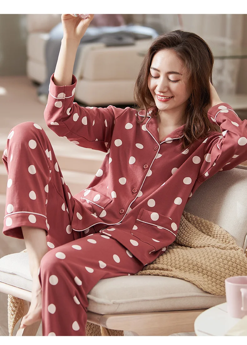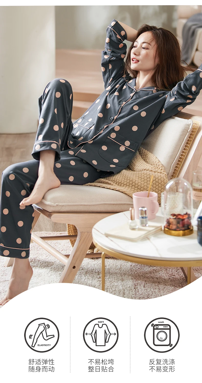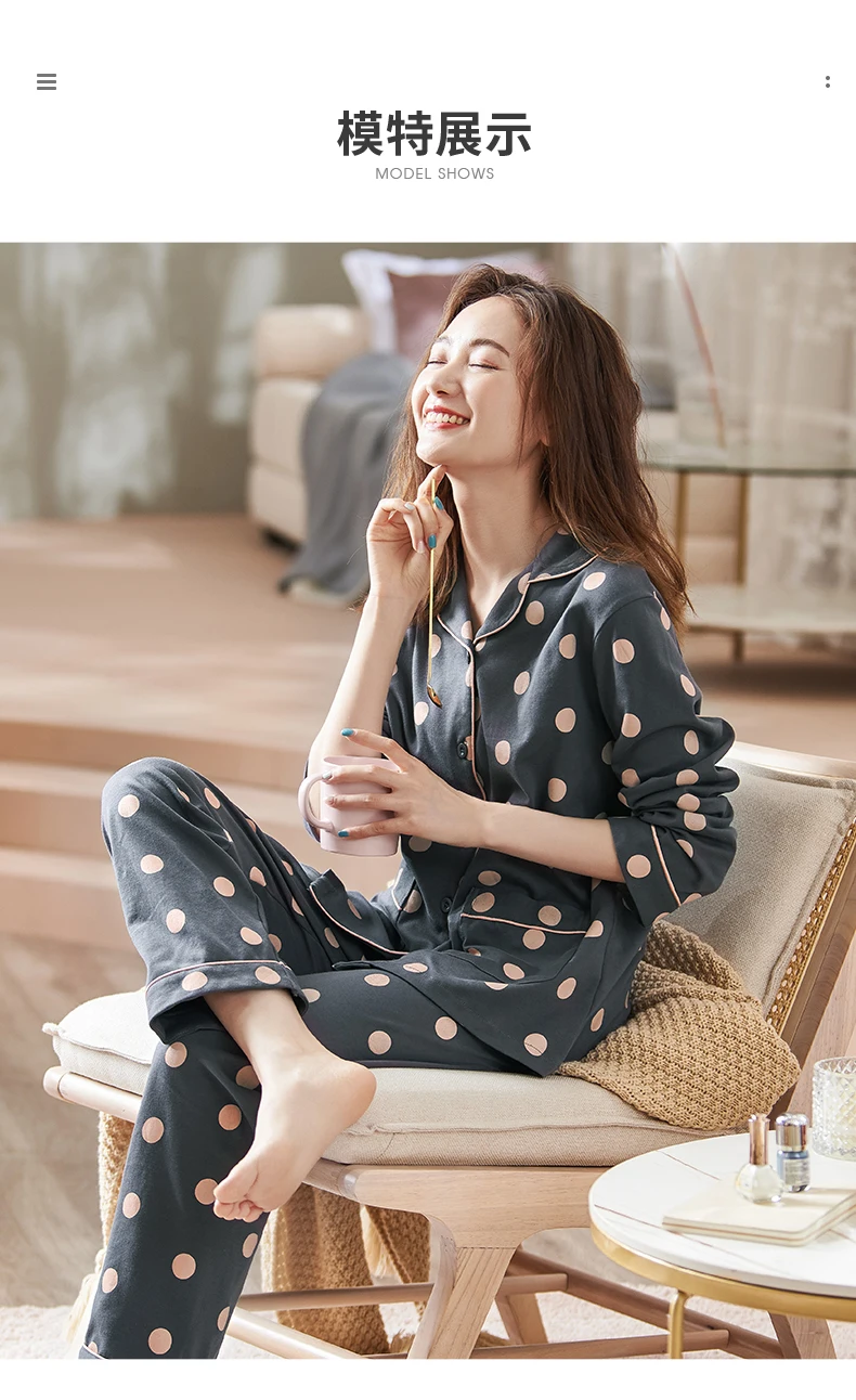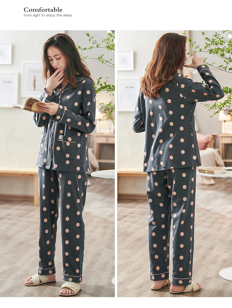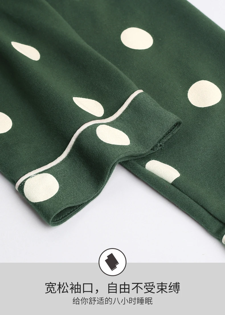 Женская обувь с узором в горошек, одежда для сна, костюм осеннее Хлопковое платье с длинными рукавами в стиле принцесс Пижама для ребенка, Повседневный Кардиган, домашняя одежда размера плюс M-3XL Пижама Mujer