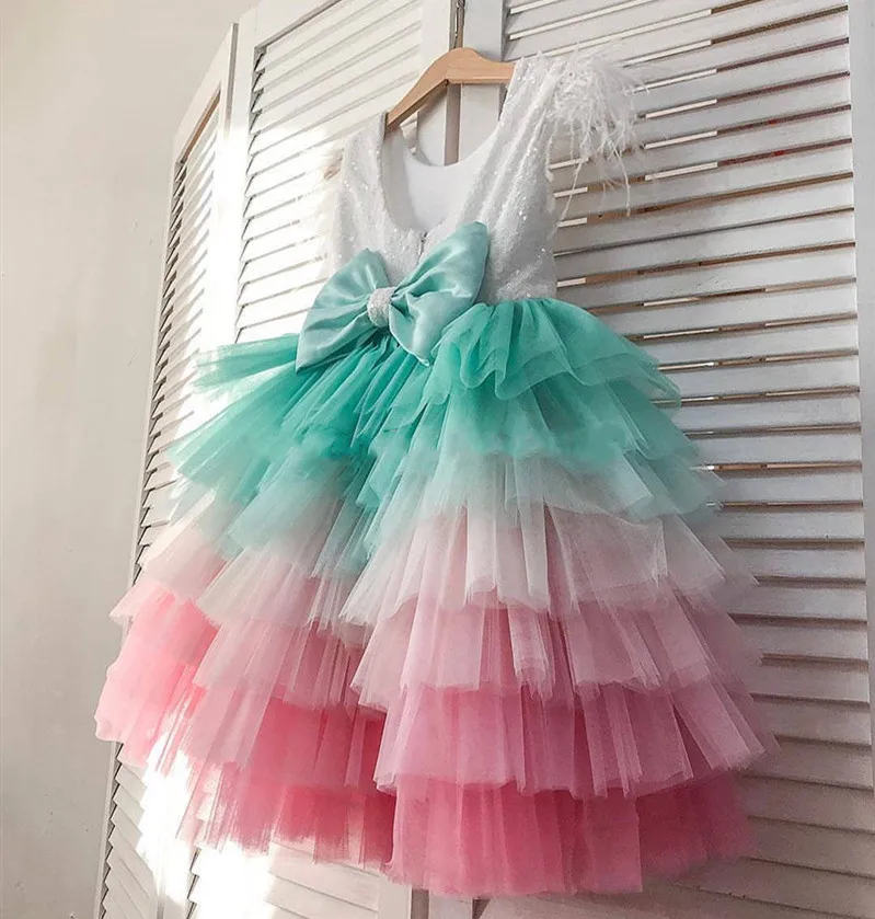 Розовые синие милые бальные платья для девочек Радужное платье с бо...