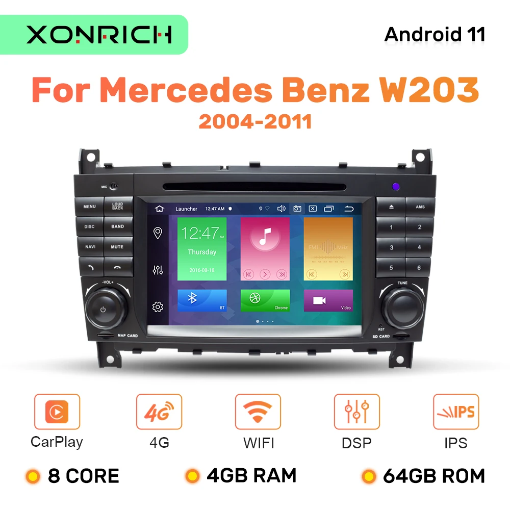 Автомобильный мультимедийный DVD-проигрыватель, 4 Гб, 2 Din, Android 11, для MercedesBenz W203 W219 A-Class A160 C-Class C200 CLK200, радио, GPS-навигация, стерео
