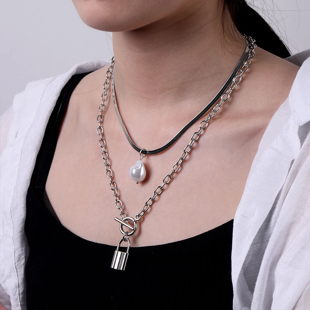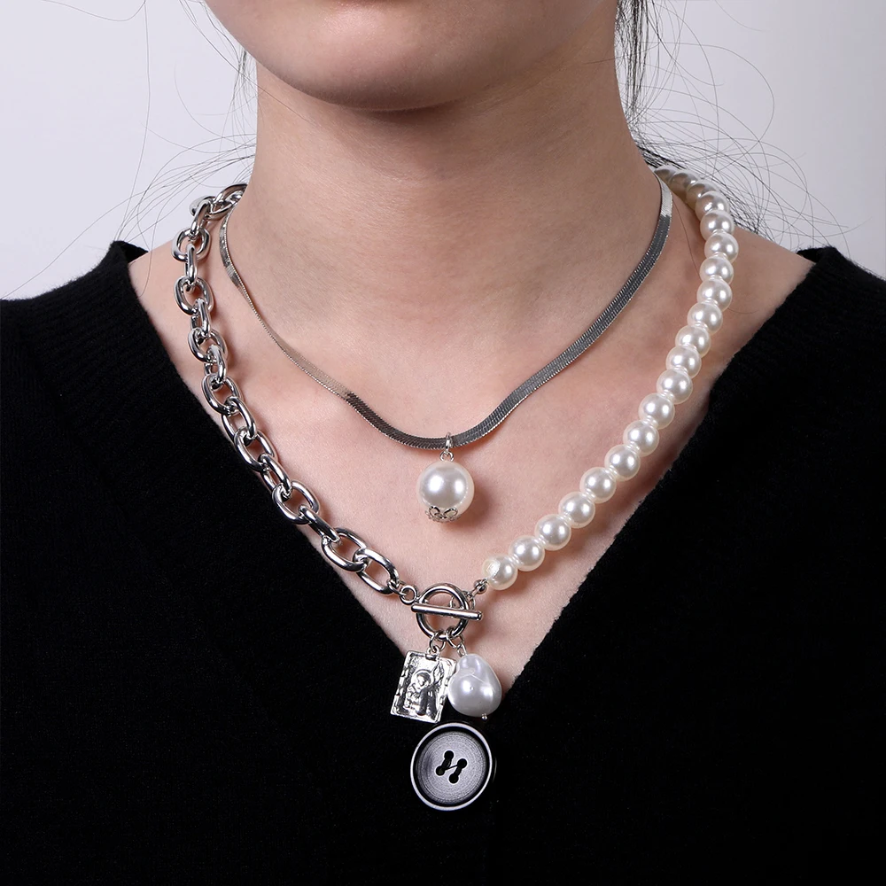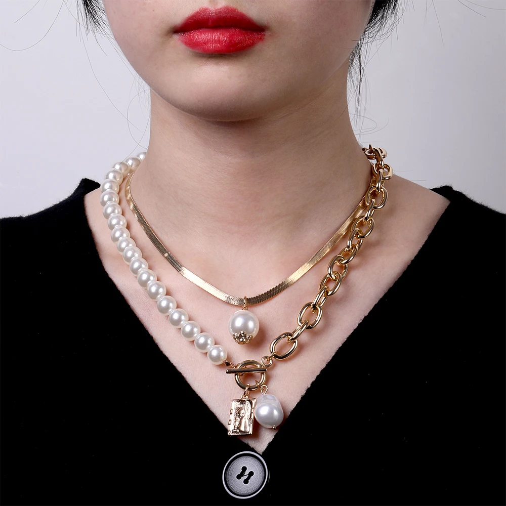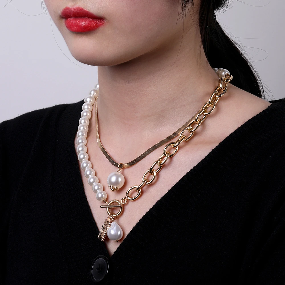Цепочка-змейка Женская золотистая, геометрические кулоны, с жемчугом