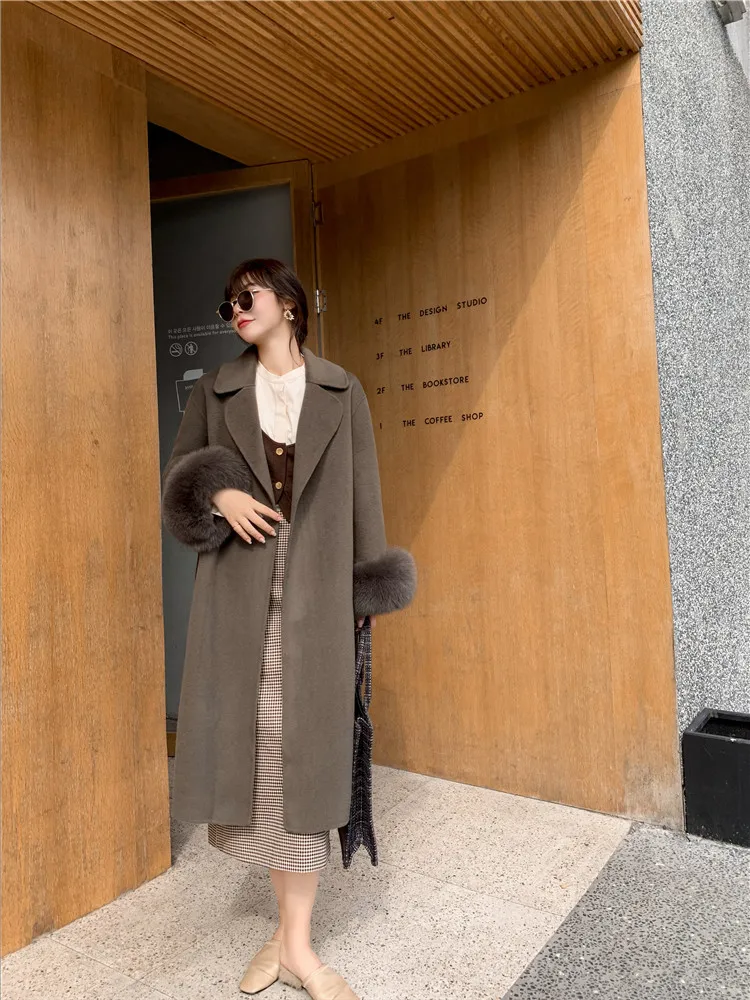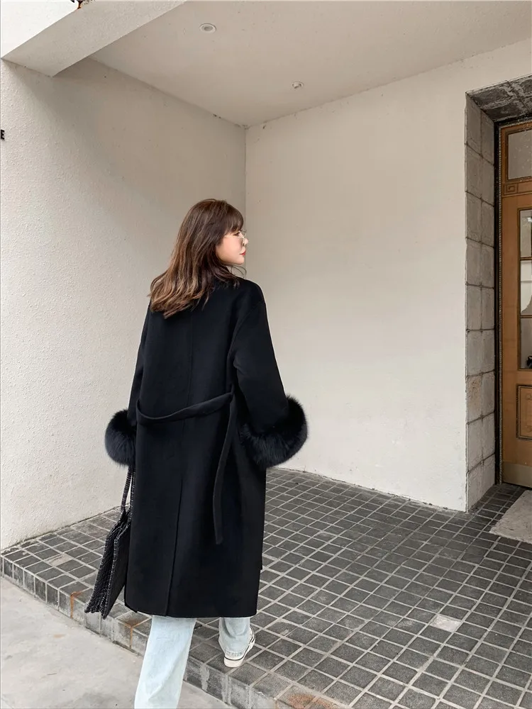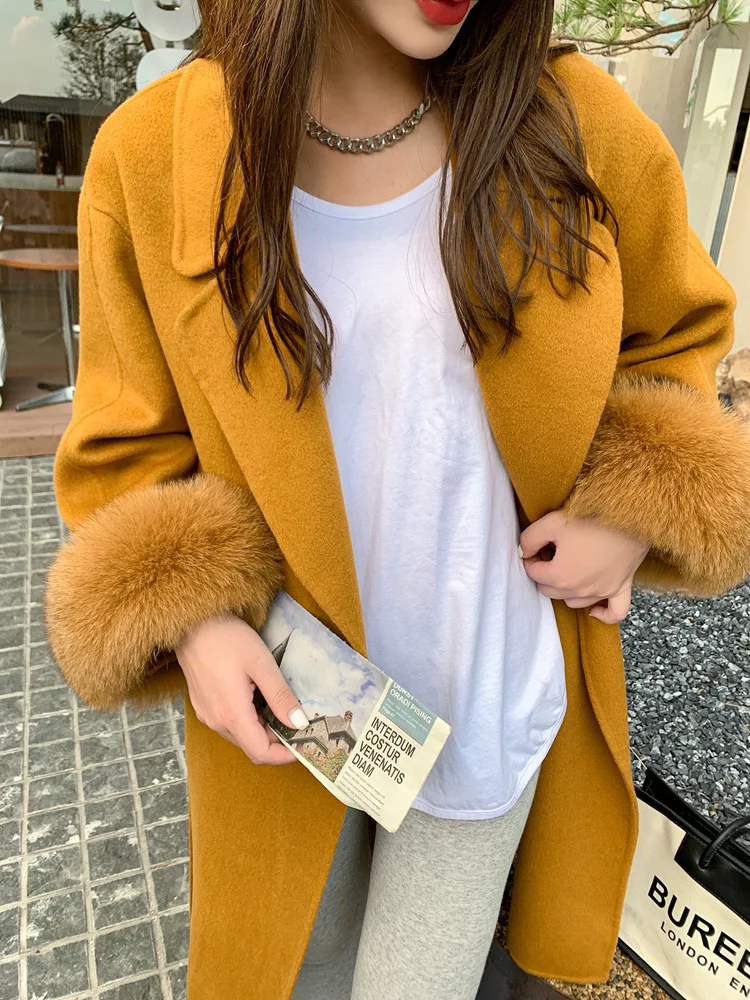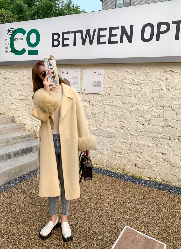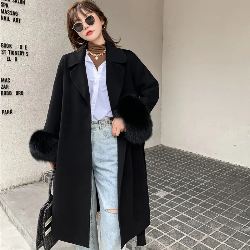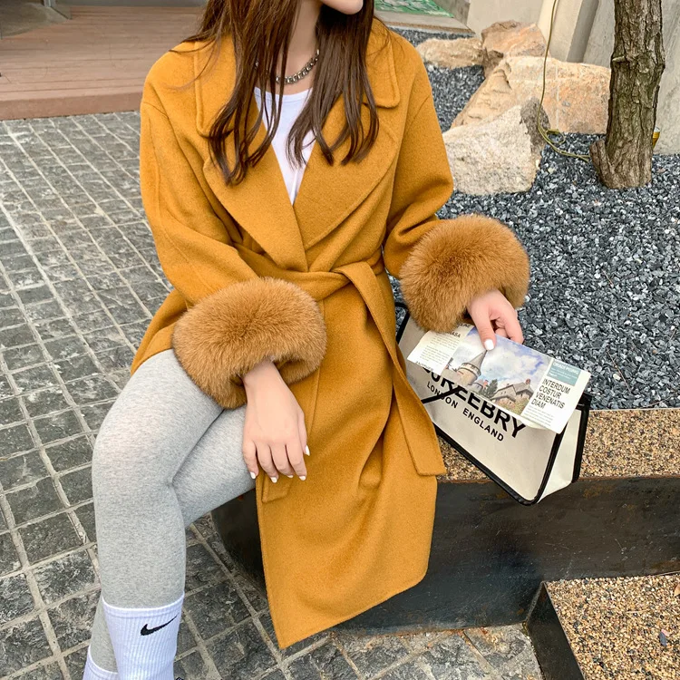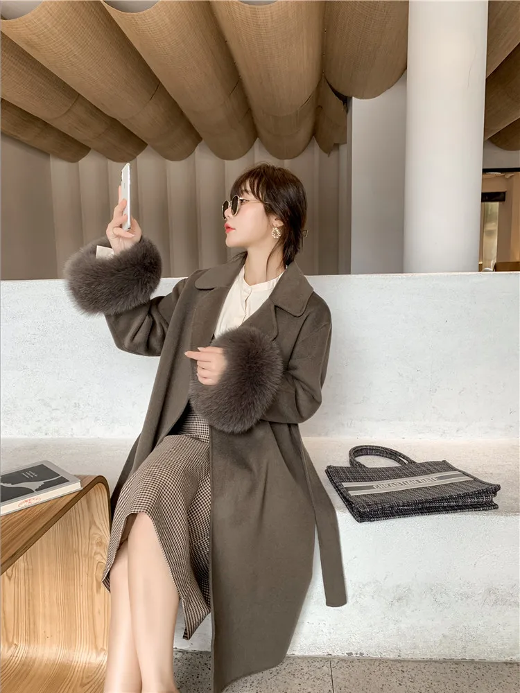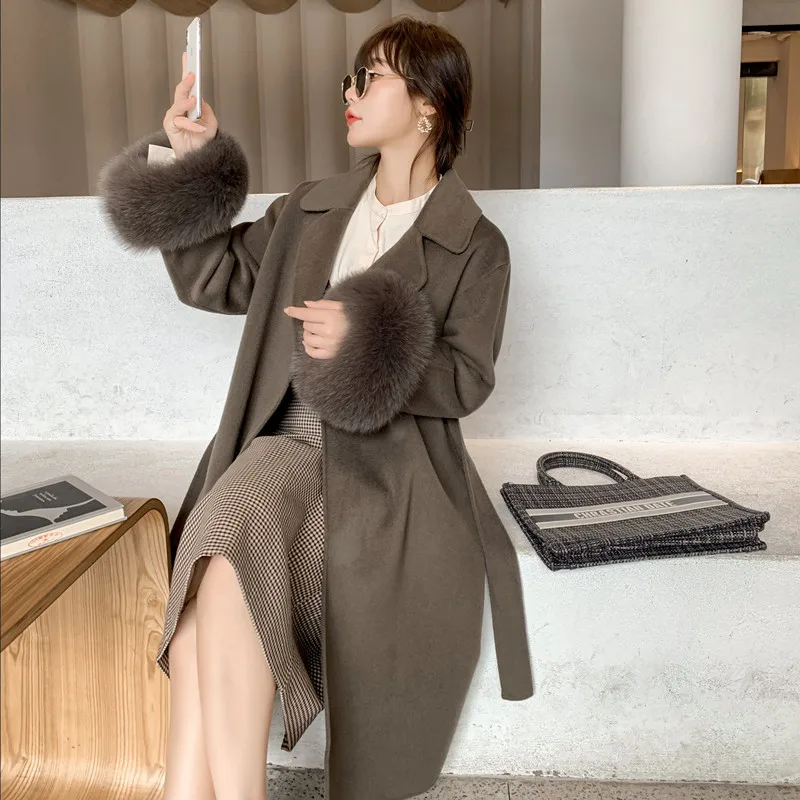 Женское двухстороннее кашемировое пальто с карманами, Свободное длинное пальто с манжетами из натурального меха, зима 2021