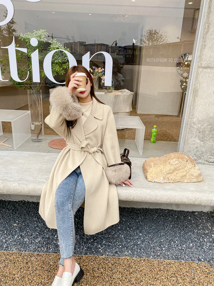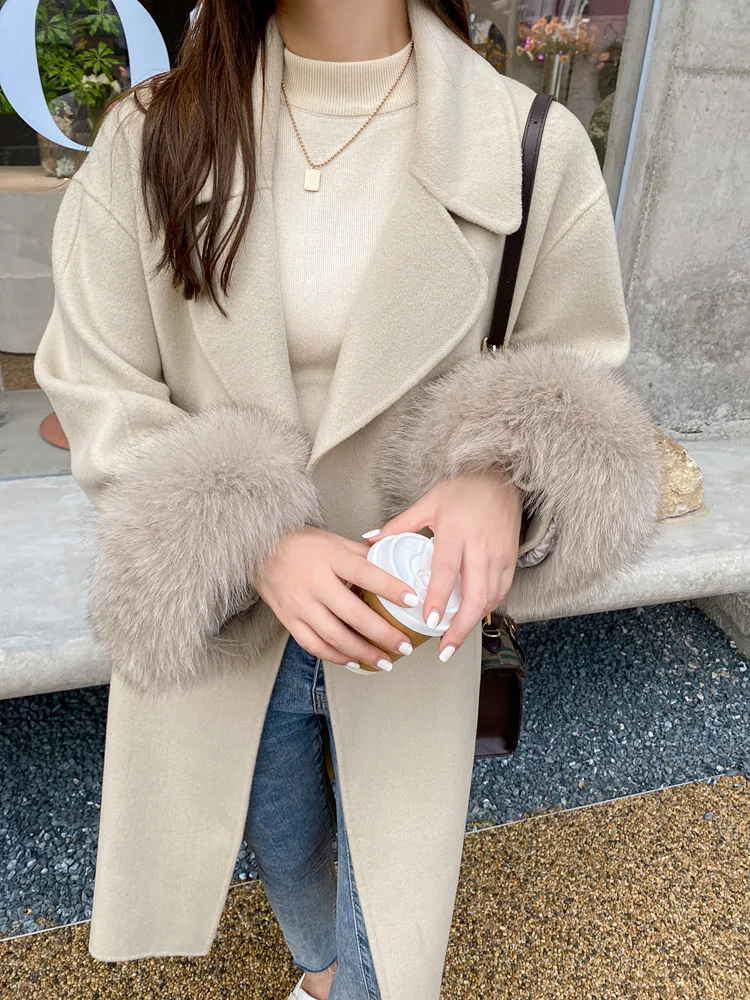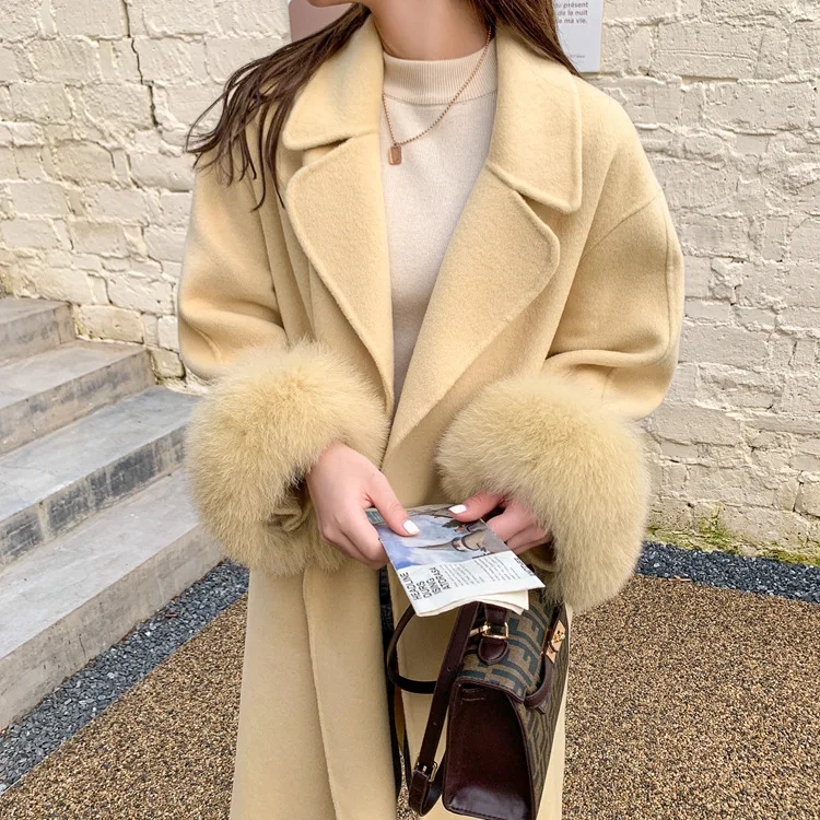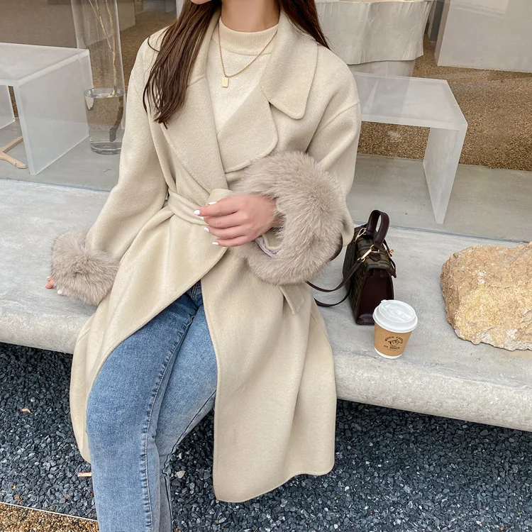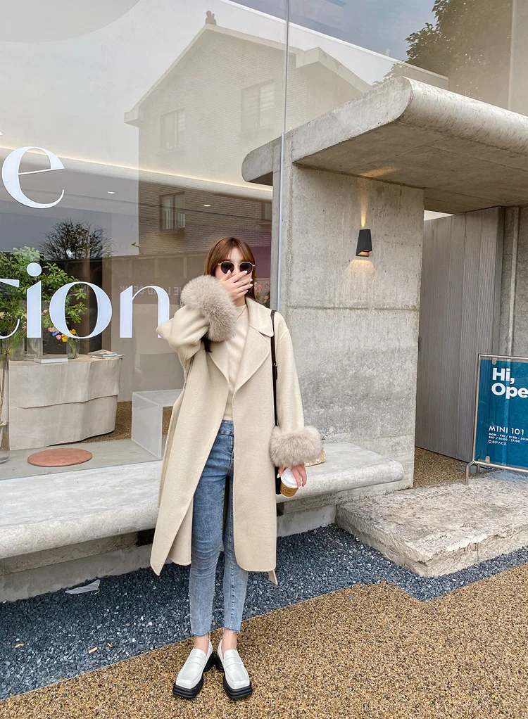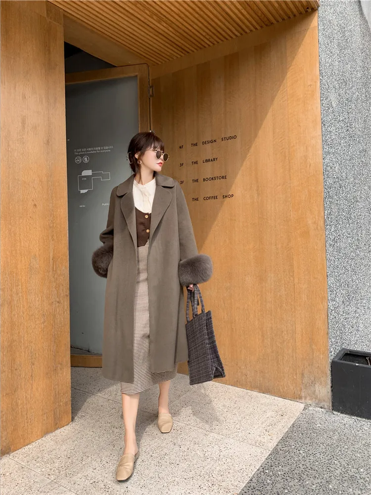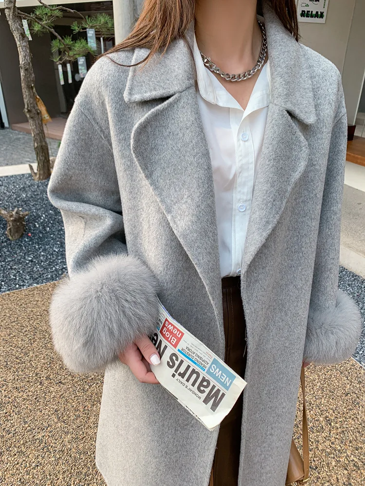 Женское двухстороннее кашемировое пальто с карманами, Свободное длинное пальто с манжетами из натурального меха, зима 2021