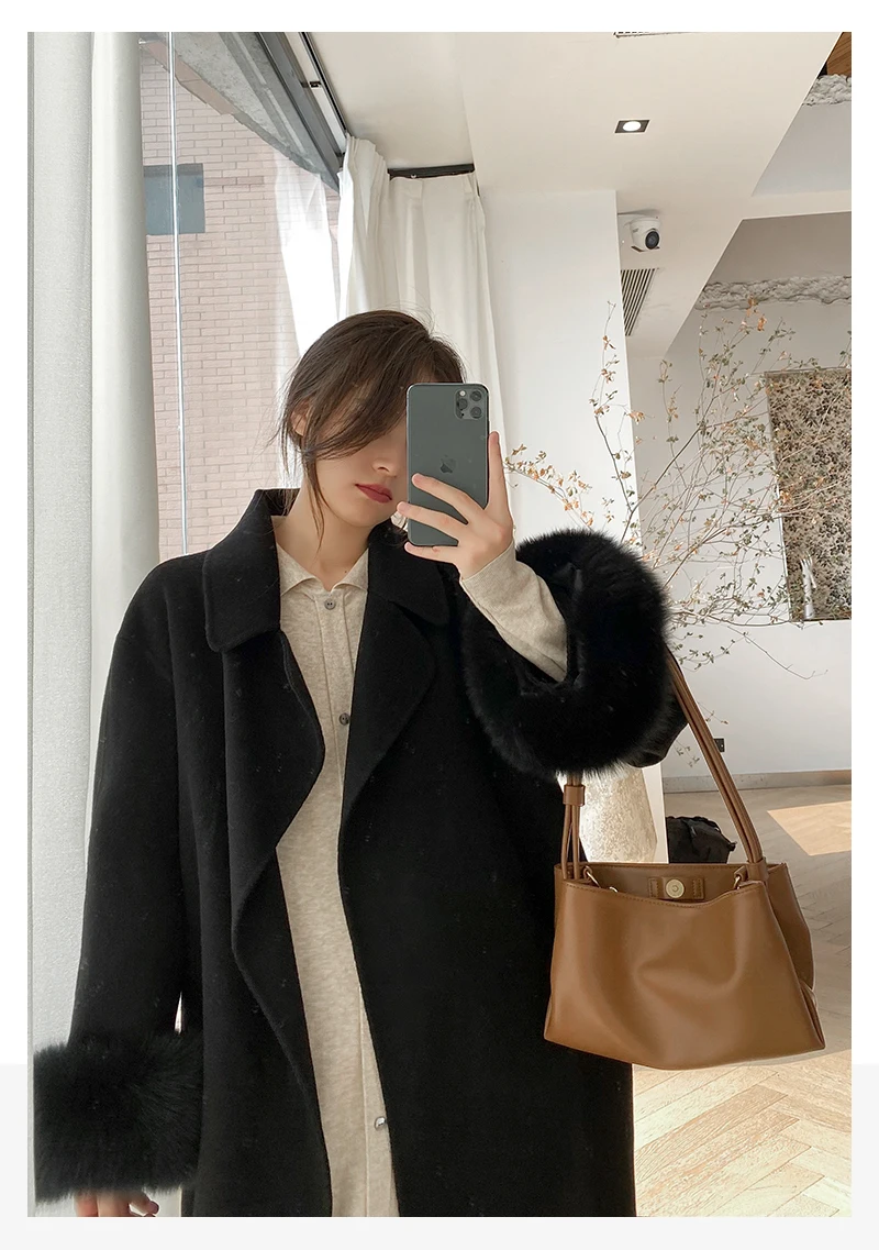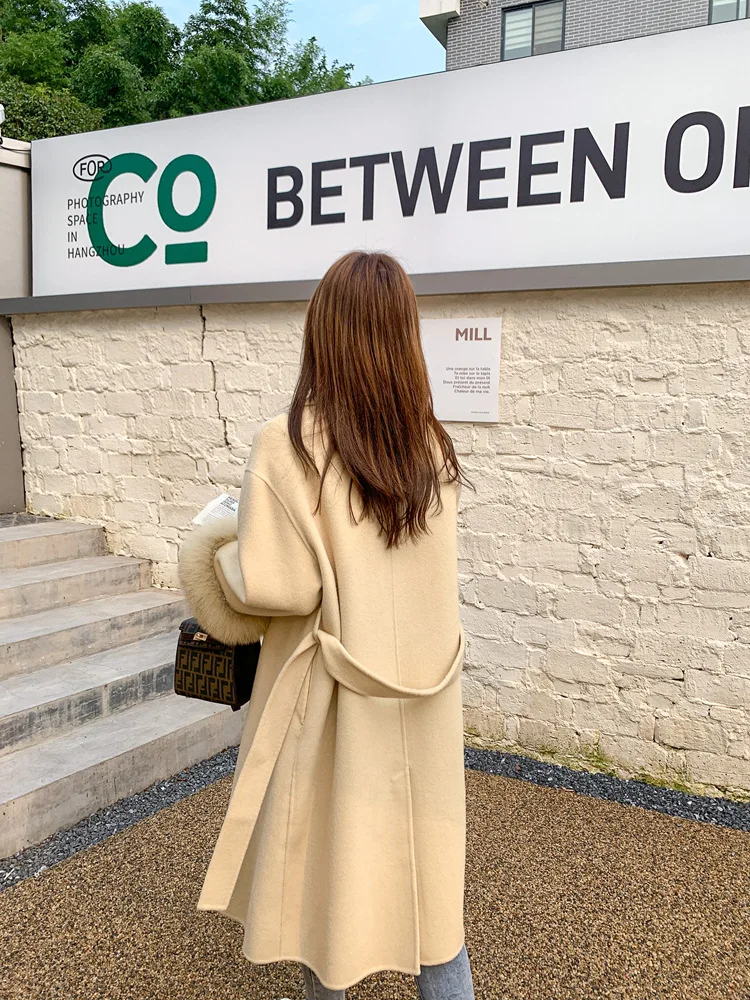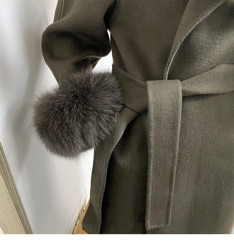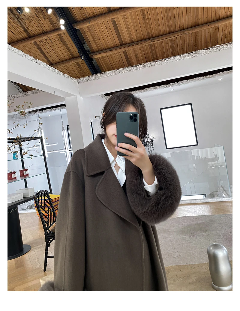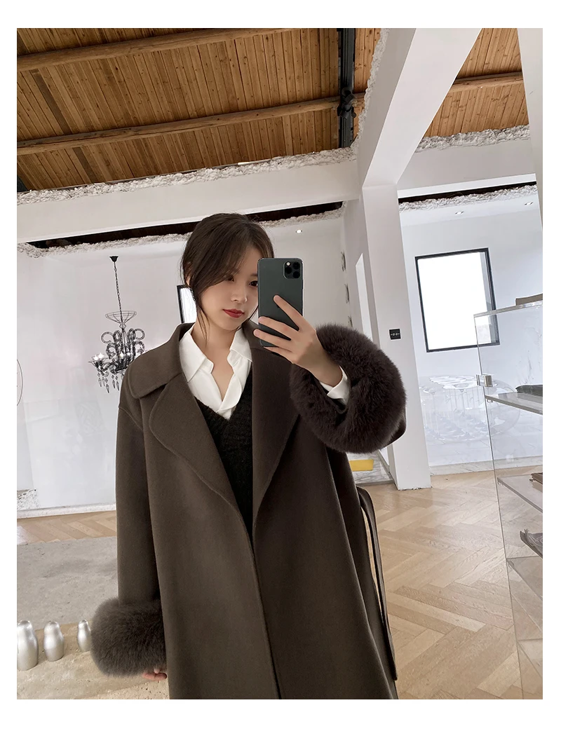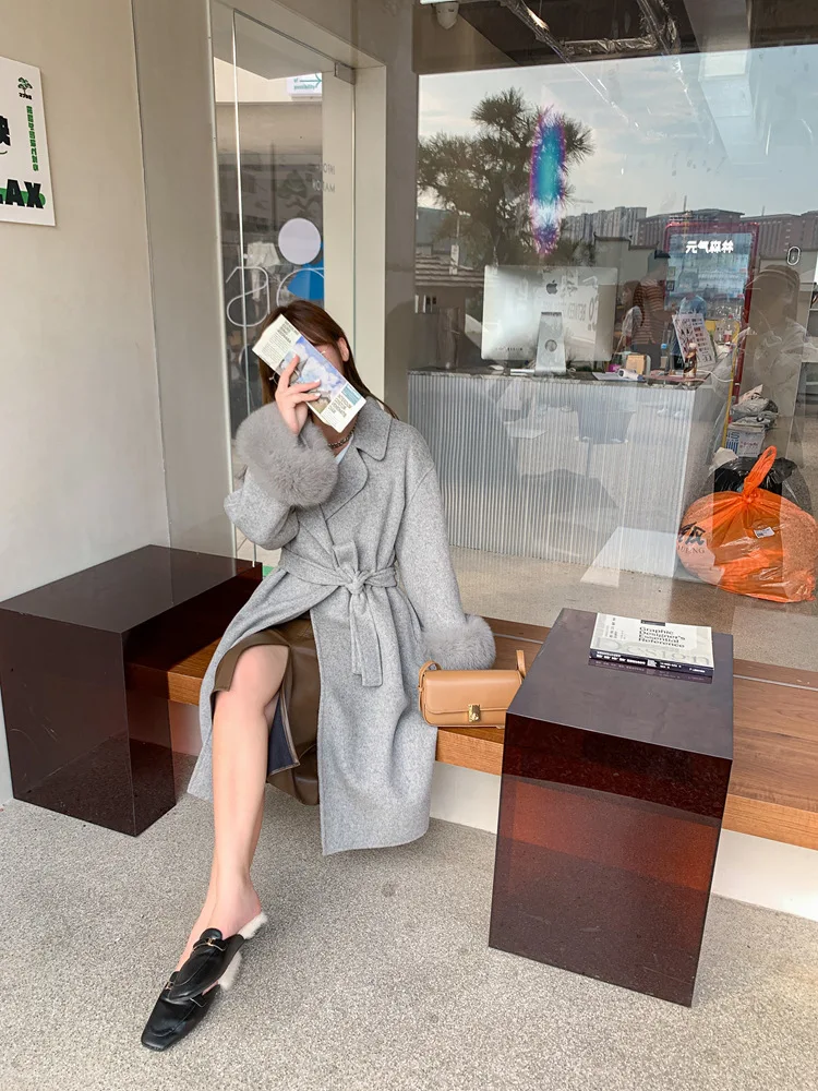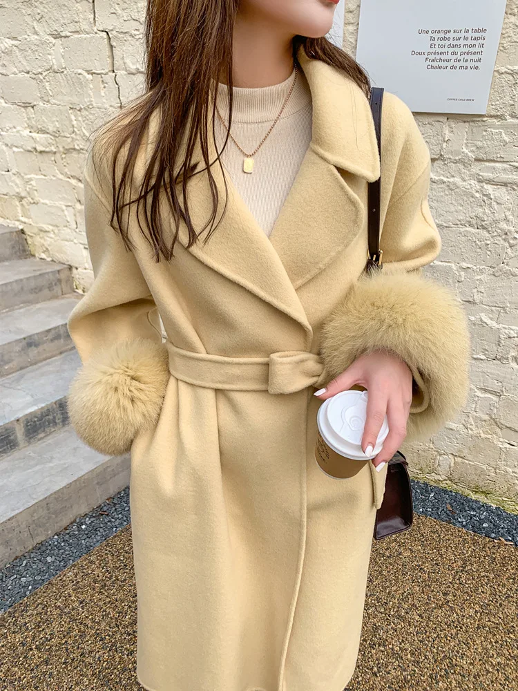 Женское двухстороннее кашемировое пальто с карманами, Свободное длинное пальто с манжетами из натурального меха, зима 2021
