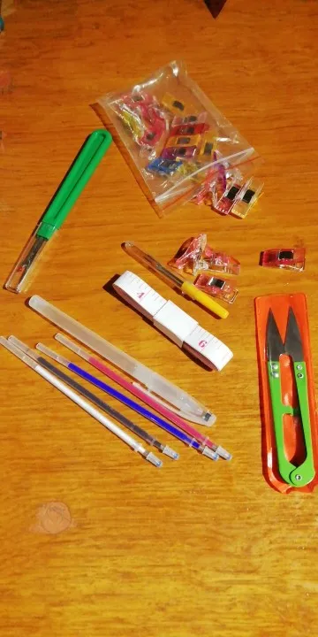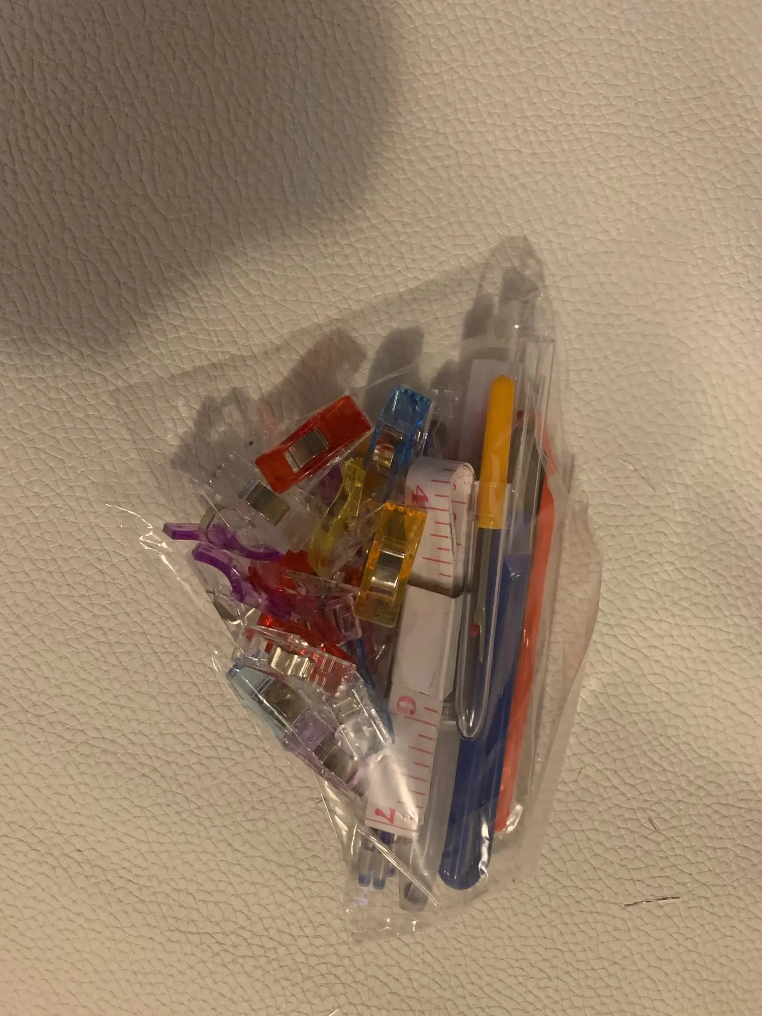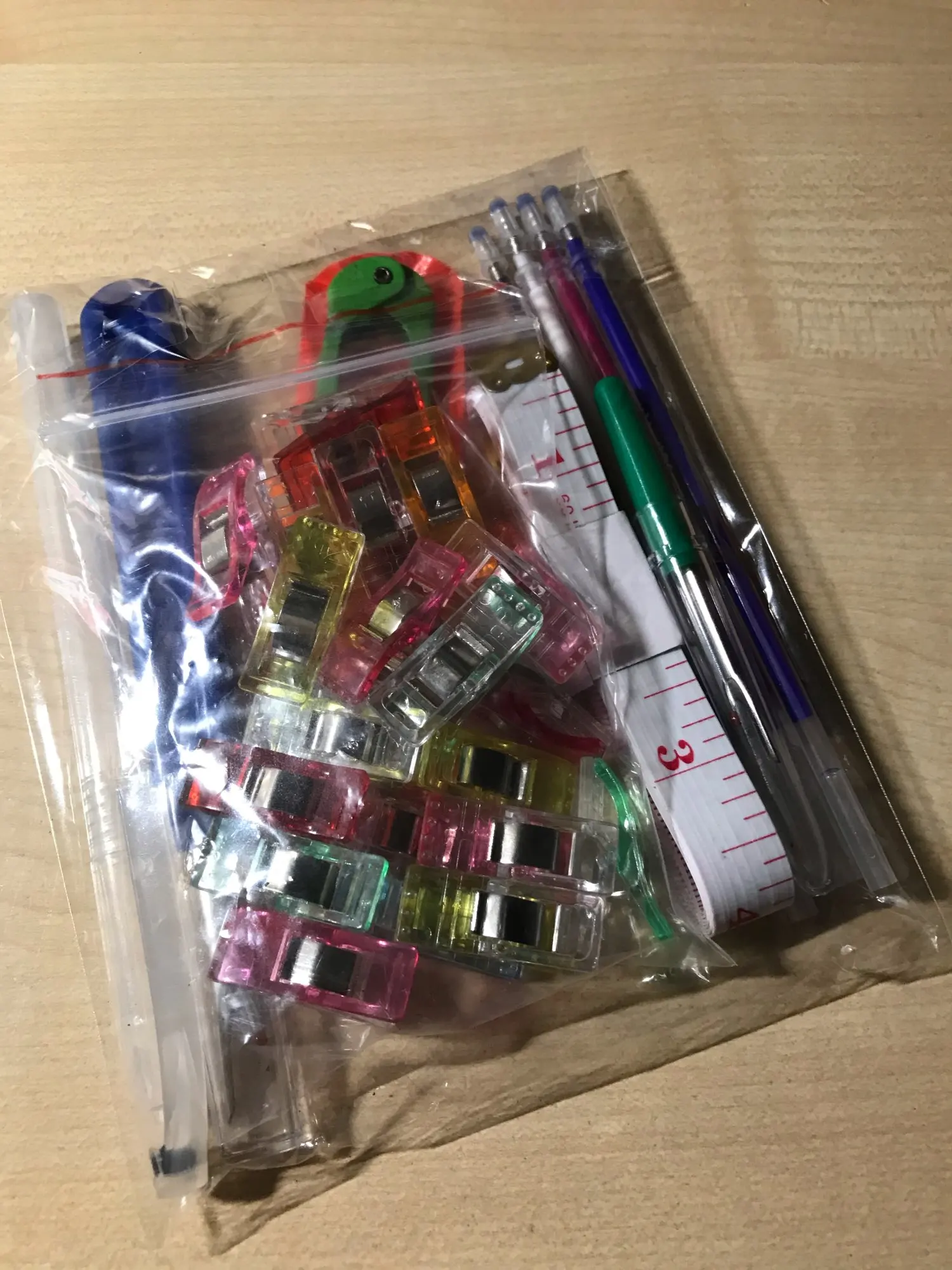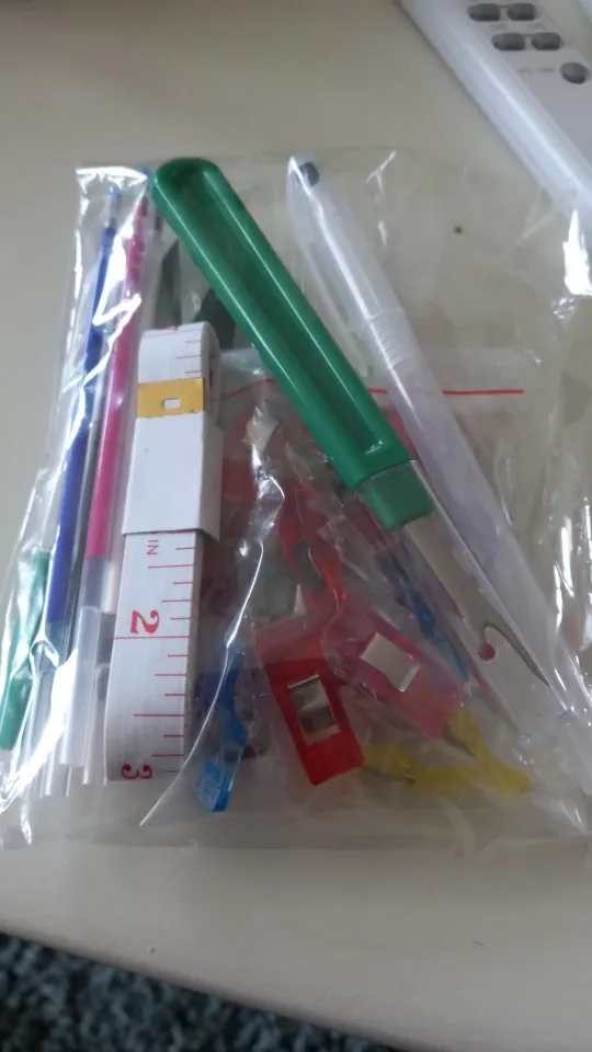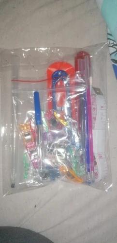 Все пришло целое. Стержни пишут. Ножницы режут. Прищепки прищепляют. Лента меряет.Все нравится.