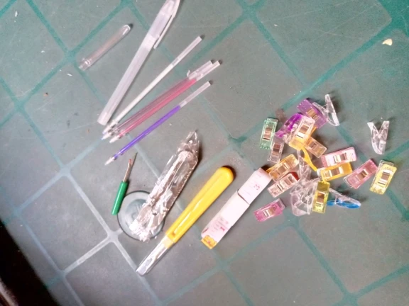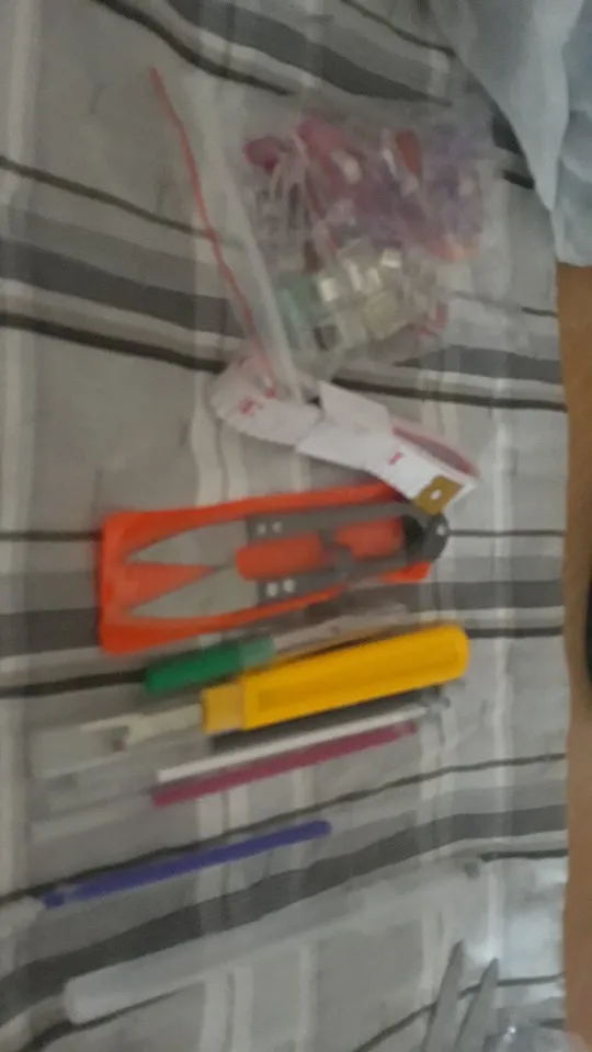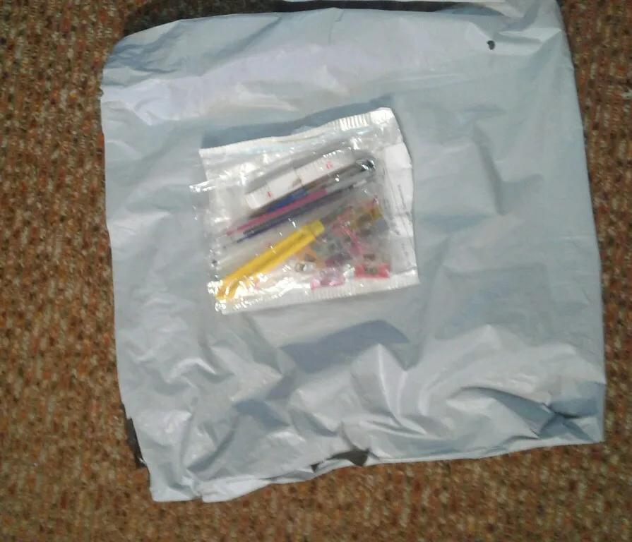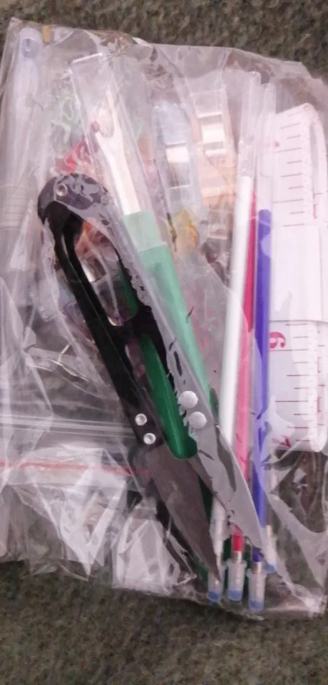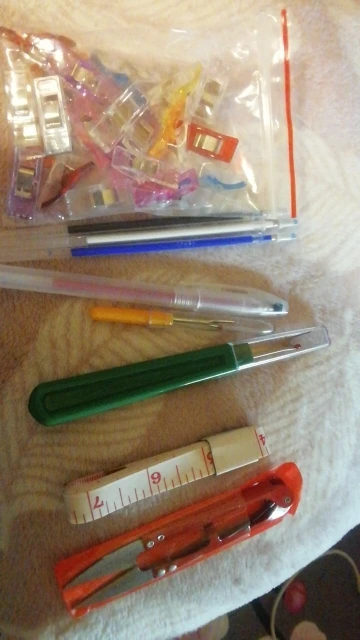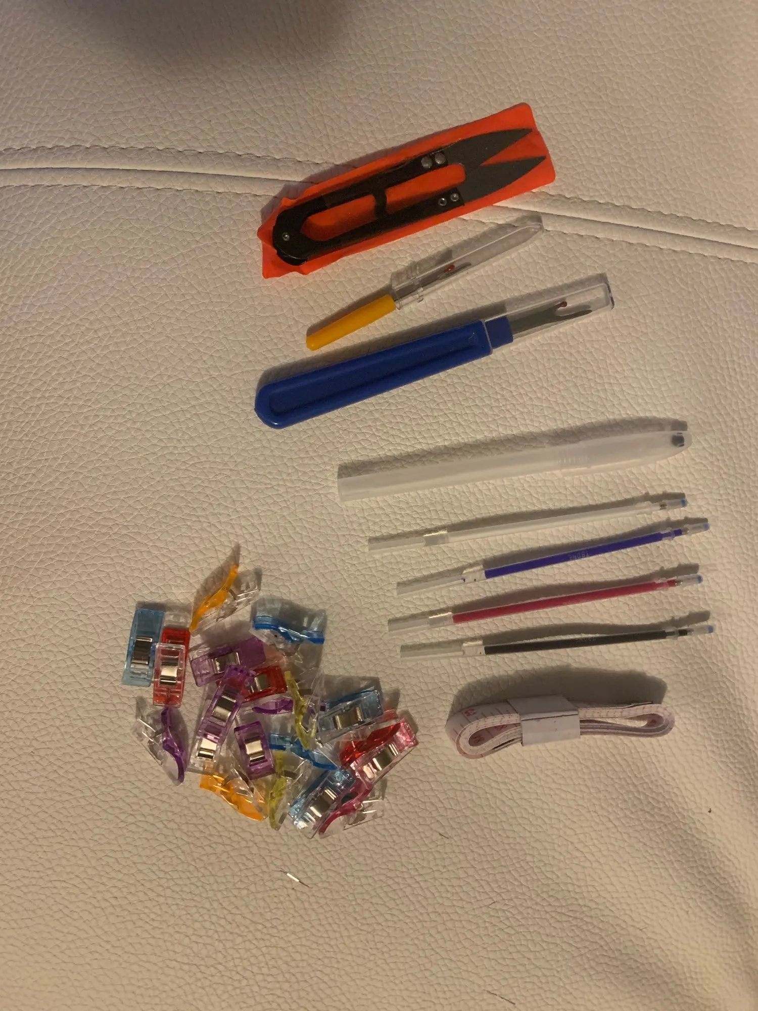 Все пришло целое. Стержни пишут. Ножницы режут. Прищепки прищепляют. Лента меряет.Все нравится.