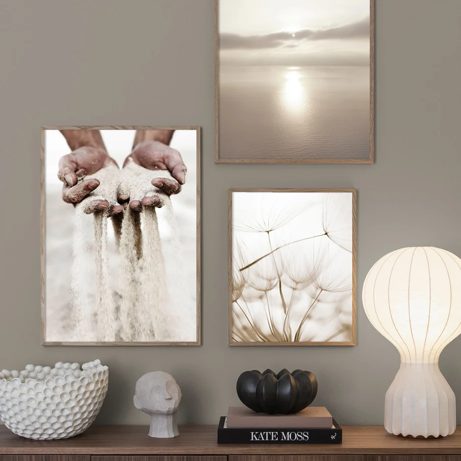 Плакат с изображением цветов, одуванчиков, заката, птиц, пляжа, тра...