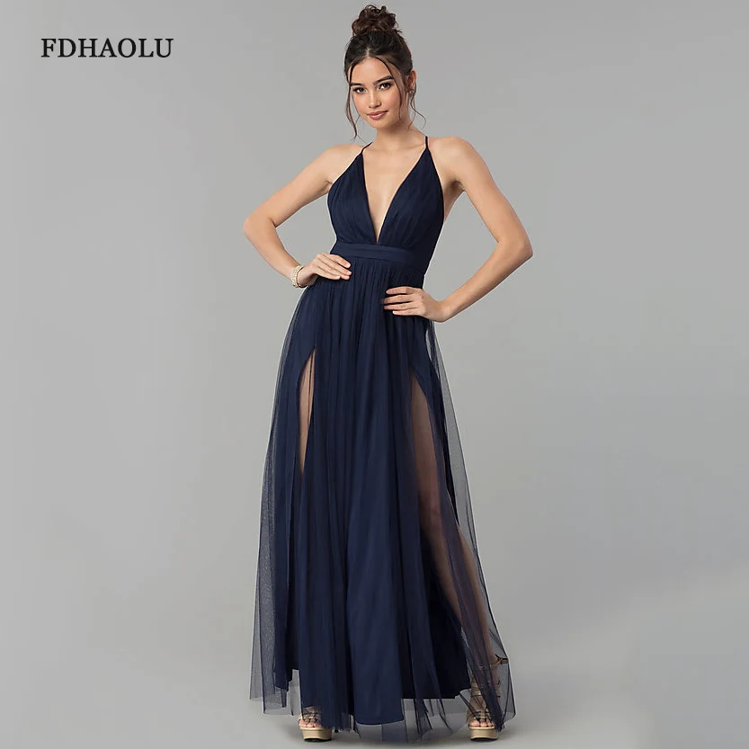 Черное длинное вечернее платье AE80, сексуальное платье с глубоким V-образным вырезом, с высоким разрезом, платье для выпускного вечера, ТРАПЕЦИЕВИДНОЕ ПЛАТЬЕ ИЗ ТЮЛЯ