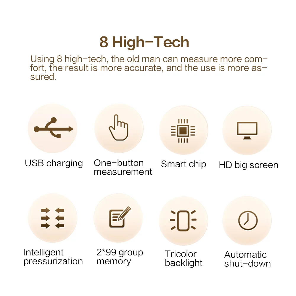 1. Измерьте шарниры руки 2. Простота в эксплуатации 3. Автоматическое измерение 4. Память 99 групп 5. Запрос данных памяти в последовательности 6.LCD HD дисплей 7. Операция автоматически отключается в течение 1 минуты без операции 8. Точность: Артериальное давление ± 3% Пульс ± 5% 9. Диапазон измерения: Артериальное давление 0 ~ 280 мм рт. Ст. Пульс 40 ~ 199 раз/минута 10.USB функция зарядки 11.большой экран. Большой шрифт 12. Нормальное кровяное давление на экране отображается синим, чем выше кровяное давление, тем выше оранжевый кровяное давление