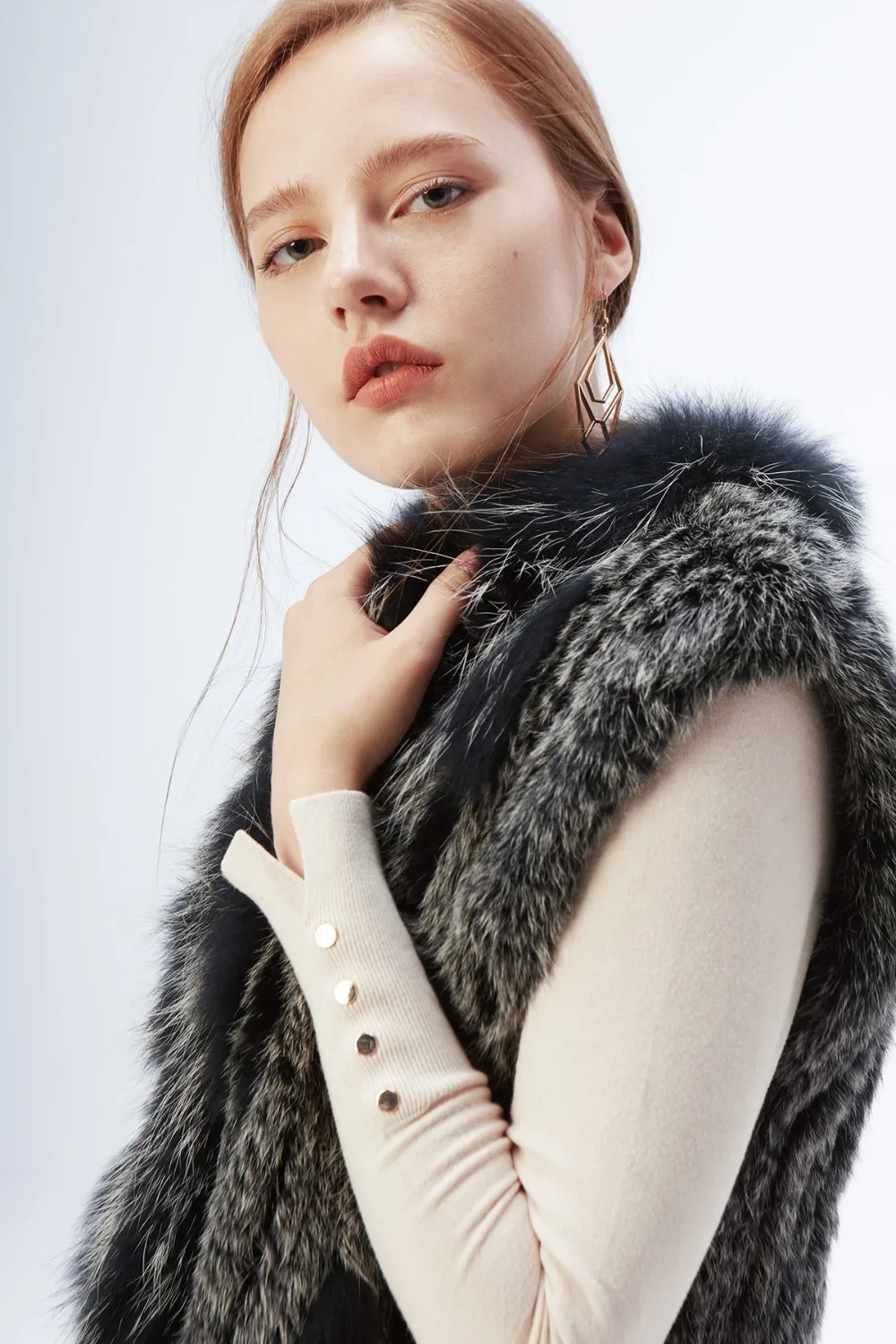 Жилет из натурального кроличьего меха с воротником из меха енота ве...