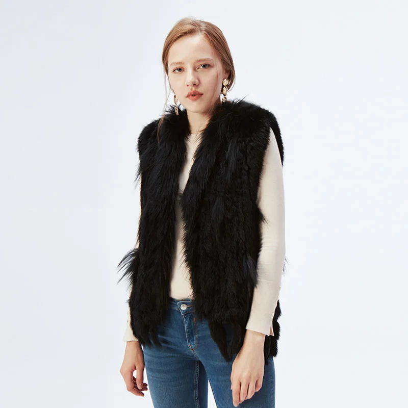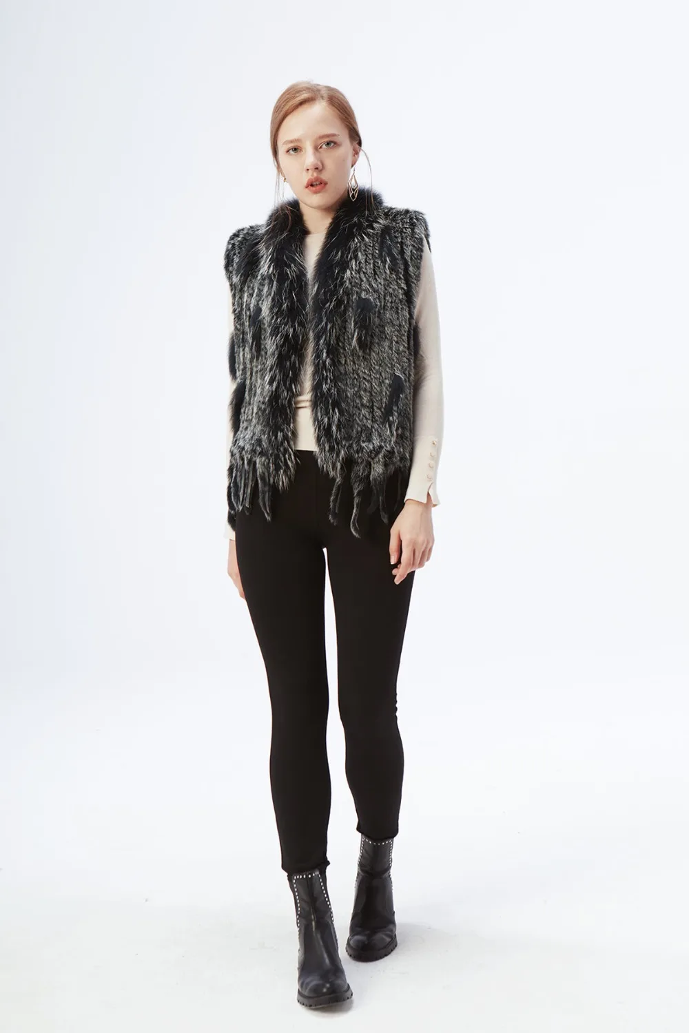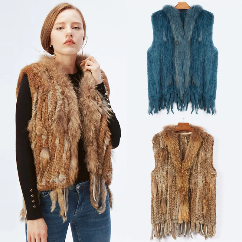 Жилет из натурального кроличьего меха с воротником из меха енота, Женский праздничный жилет, вязаная верхняя одежда, женский модный жилет с кисточками