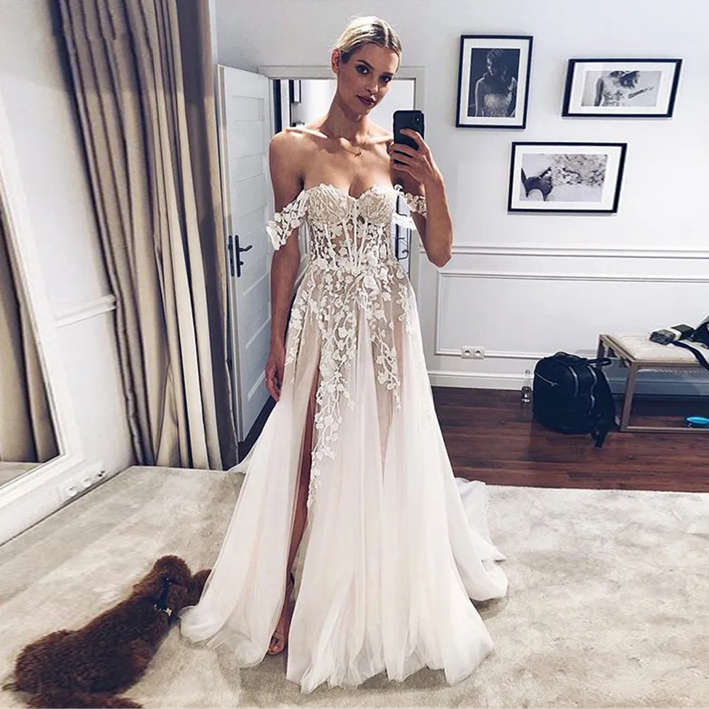 Женское свадебное платье с открытыми плечами, элегантное кружевное ...