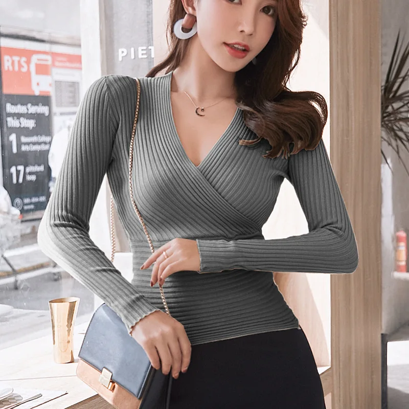 Женский осенне-зимний сексуальный тонкий свитер с глубоким v-образным вырезом, повседневный эластичный джемпер, вязаный укороченный топ с длинными рукавами, Sueter Mujer