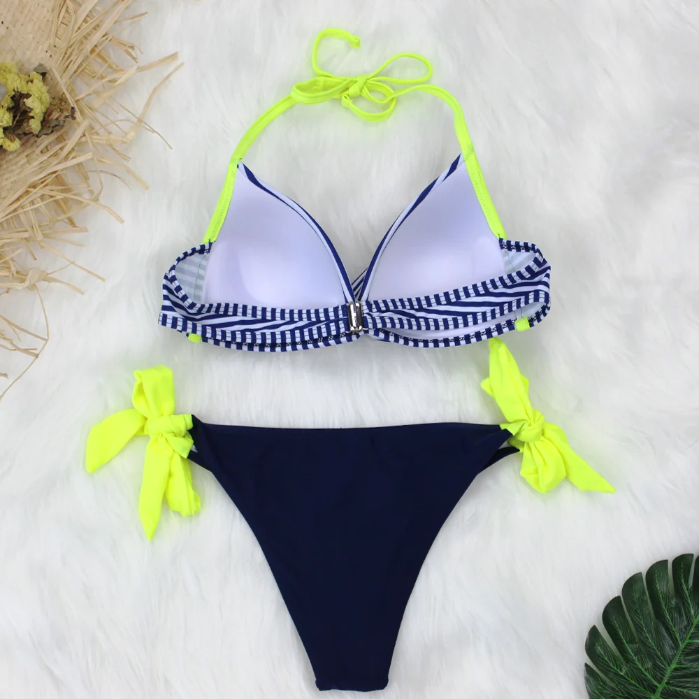 Купальник с лямкой на шее, женский купальник с заниженной талией, бикини с пуш-ап, пляжный купальный костюм, Полосатый боди, сексуальные стринги из двух предметов 2022