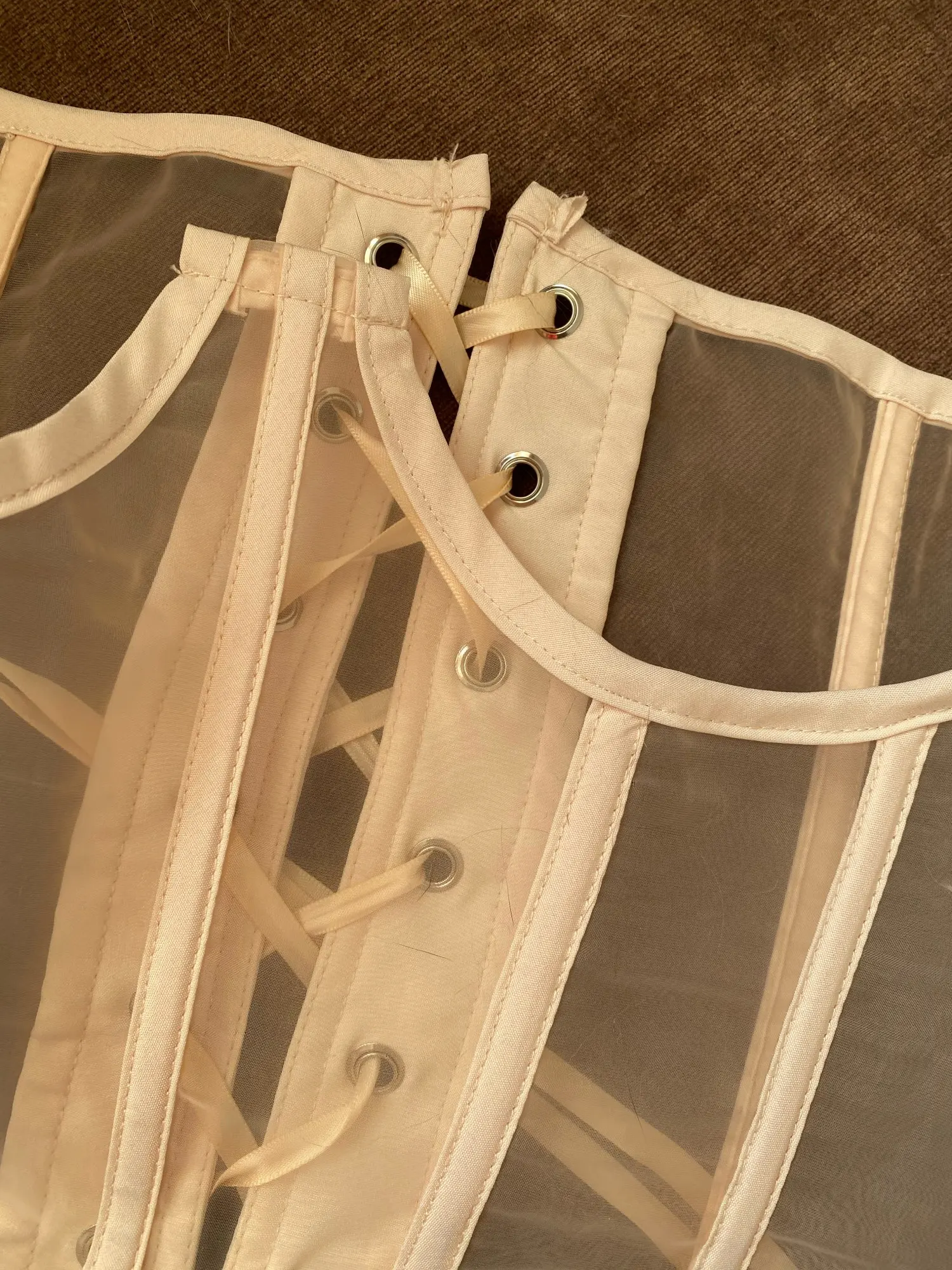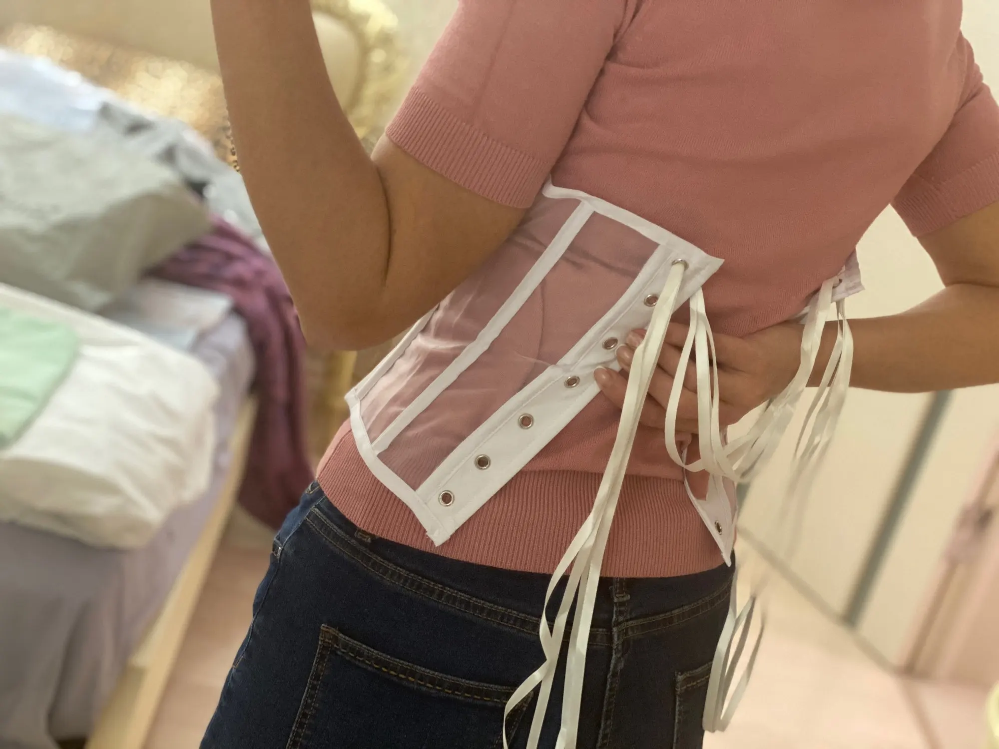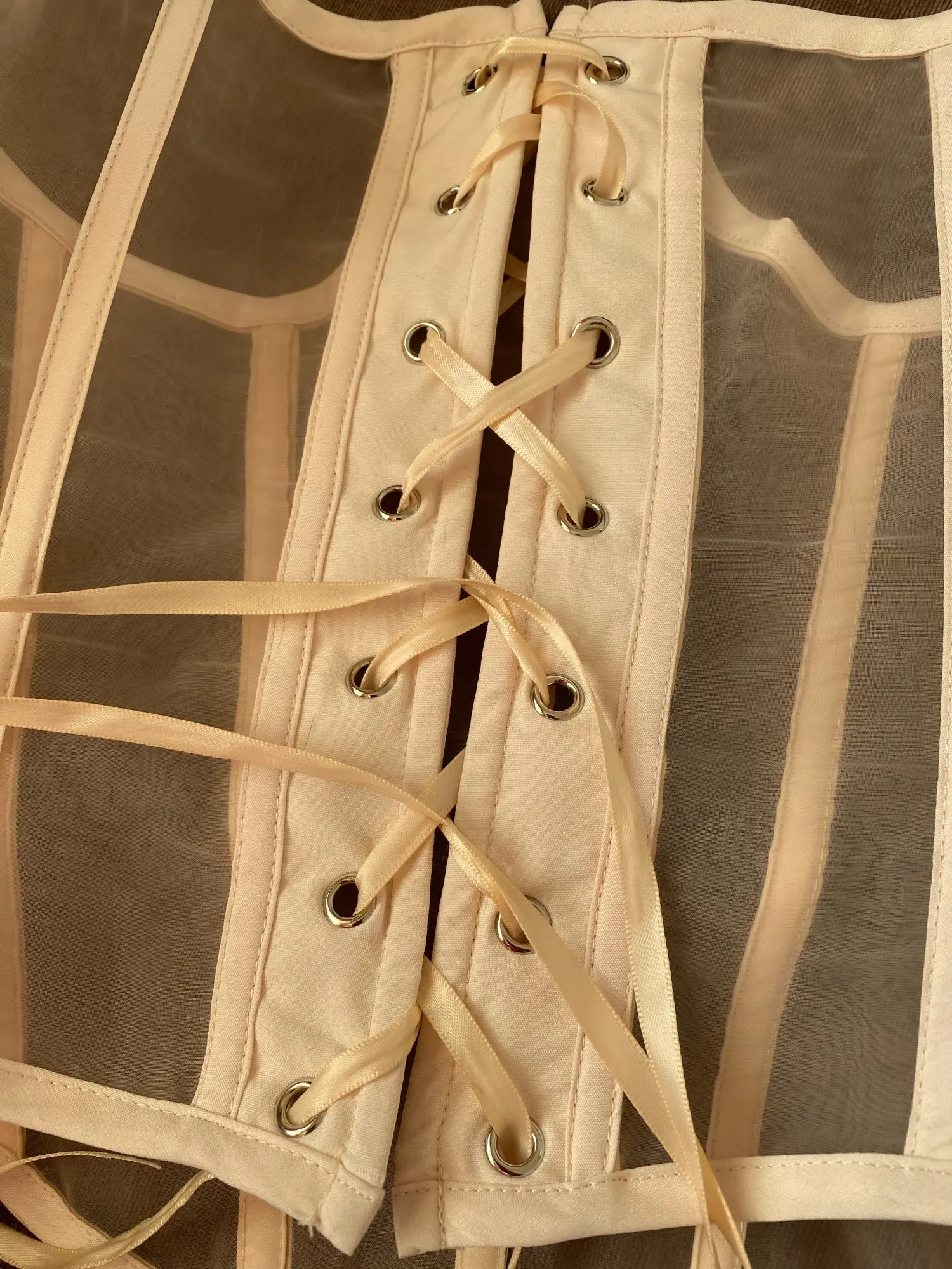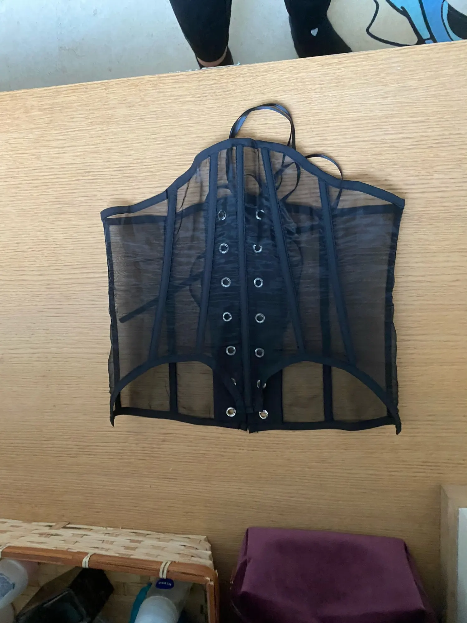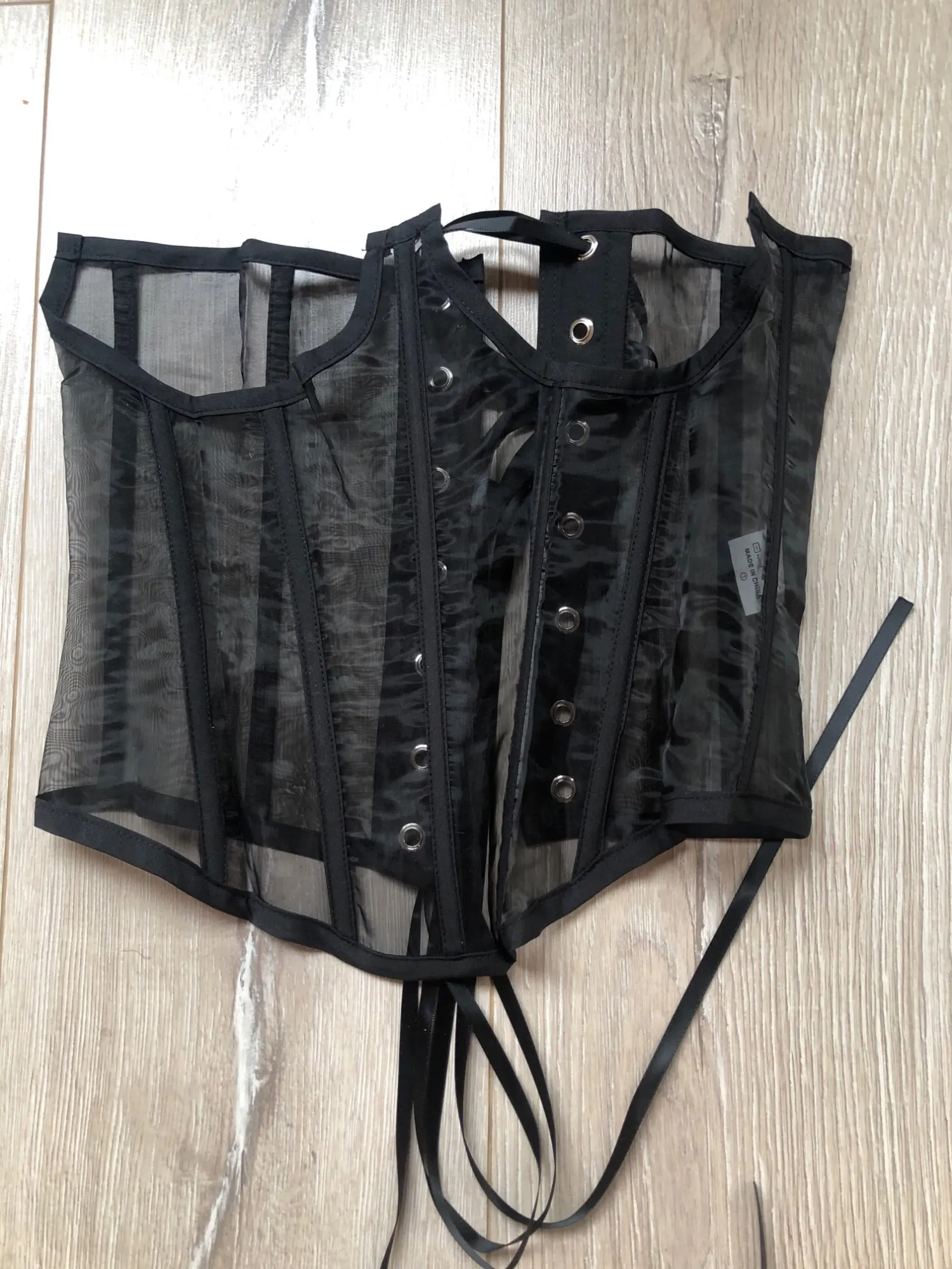 Хороший корсет. Сзади зашнуровывается длинной лентой. Длинный, внизу немного упирается в бока из за этого образуется резкий переход. Вещь интересная, но надо думать с чем носить. И думаю аккуратнее,что бы прозрачная ткань не порвалась.