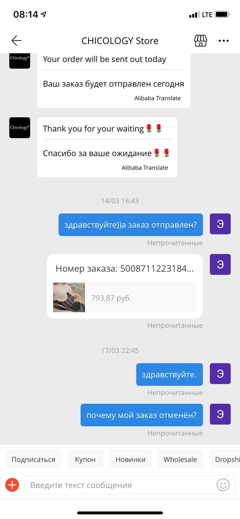 Долго думала писать или нет.Но моей возмутимости нет предела.Заказа 15.02 . Отправили заказ 8.03. 17.03 отмена заказа .Не на писала продавцу ,когда отправят,почему отменили??? В ответ тишина. Спор не открывали.Написала в службу поддержки,сначала там подтвердили что товар уехал,потом на вопрос почему произошла отмена посылки,ответа полного не дали,просто вернули деньги....