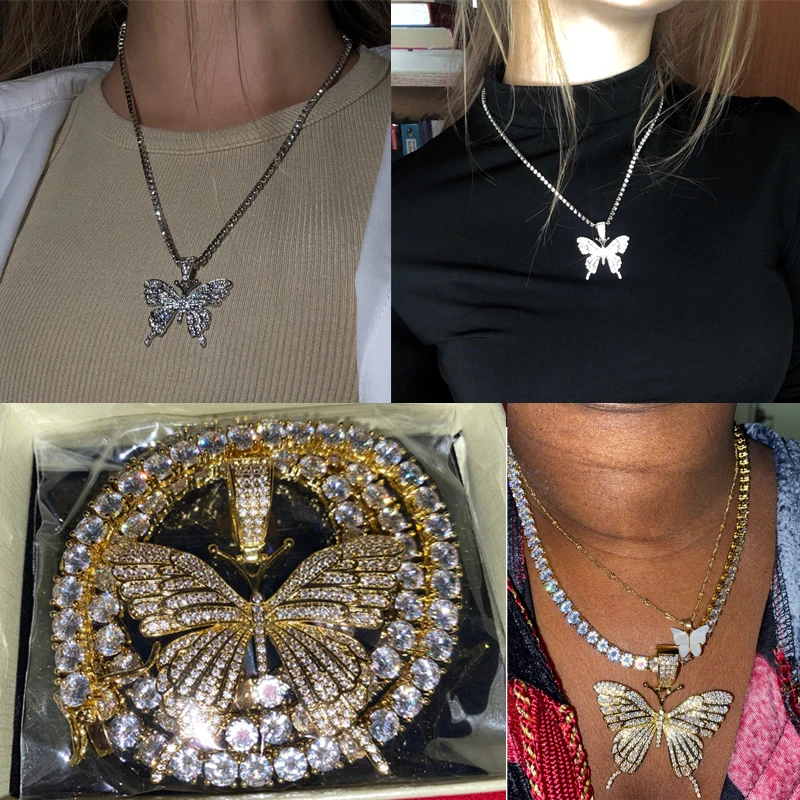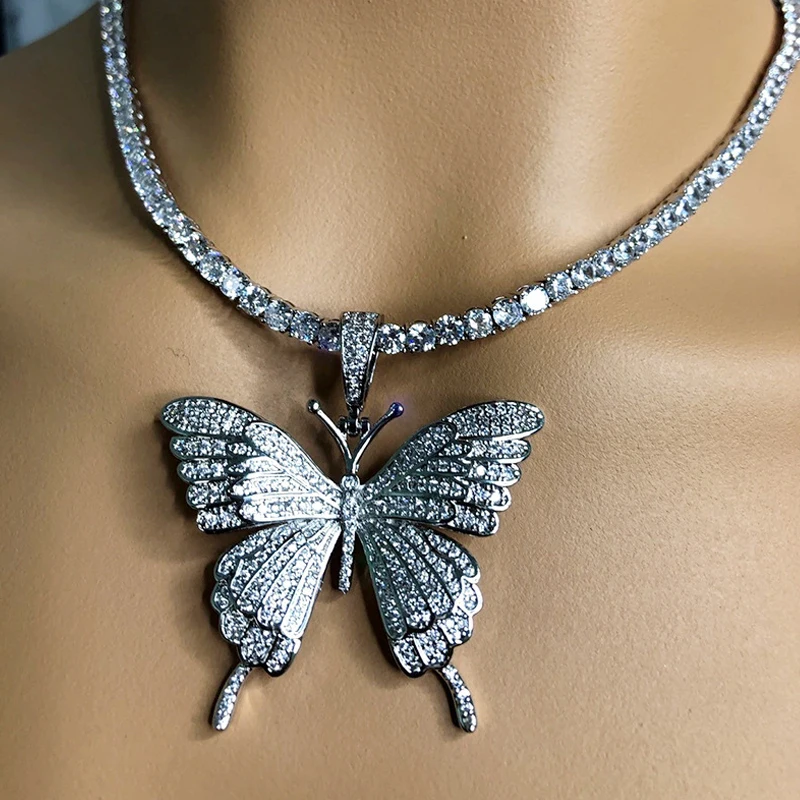Женское Ожерелье с большой бабочкой, теннисная цепь с кубическим цирконием, колье со сверкающей подвеской-бабочкой, массивное Ювелирное Украшение в стиле хип-хоп