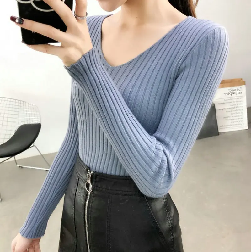Женский Повседневный тонкий свитер с v-образным вырезом, зимний однотонный базовый джемпер, вязаные топы с длинными рукавами, пуловер, Ropa Mujer Invierno