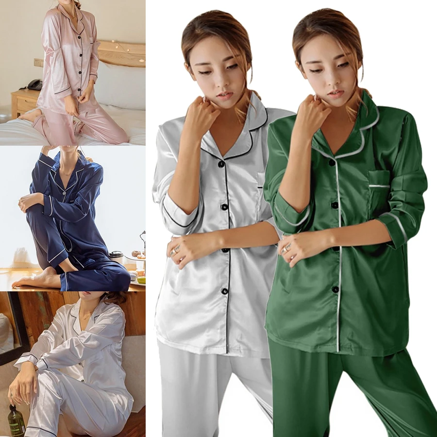 Пижама женская однобортная в полоску, Модный комплект из двух предметов, свободная шелковая атласная пижама, одежда для сна, весна-осень