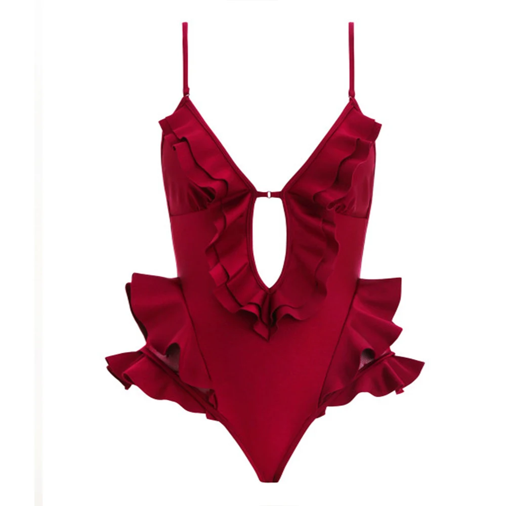Женский слитный купальник с оборками, красный слитный купальник с открытой спиной, лето 2021