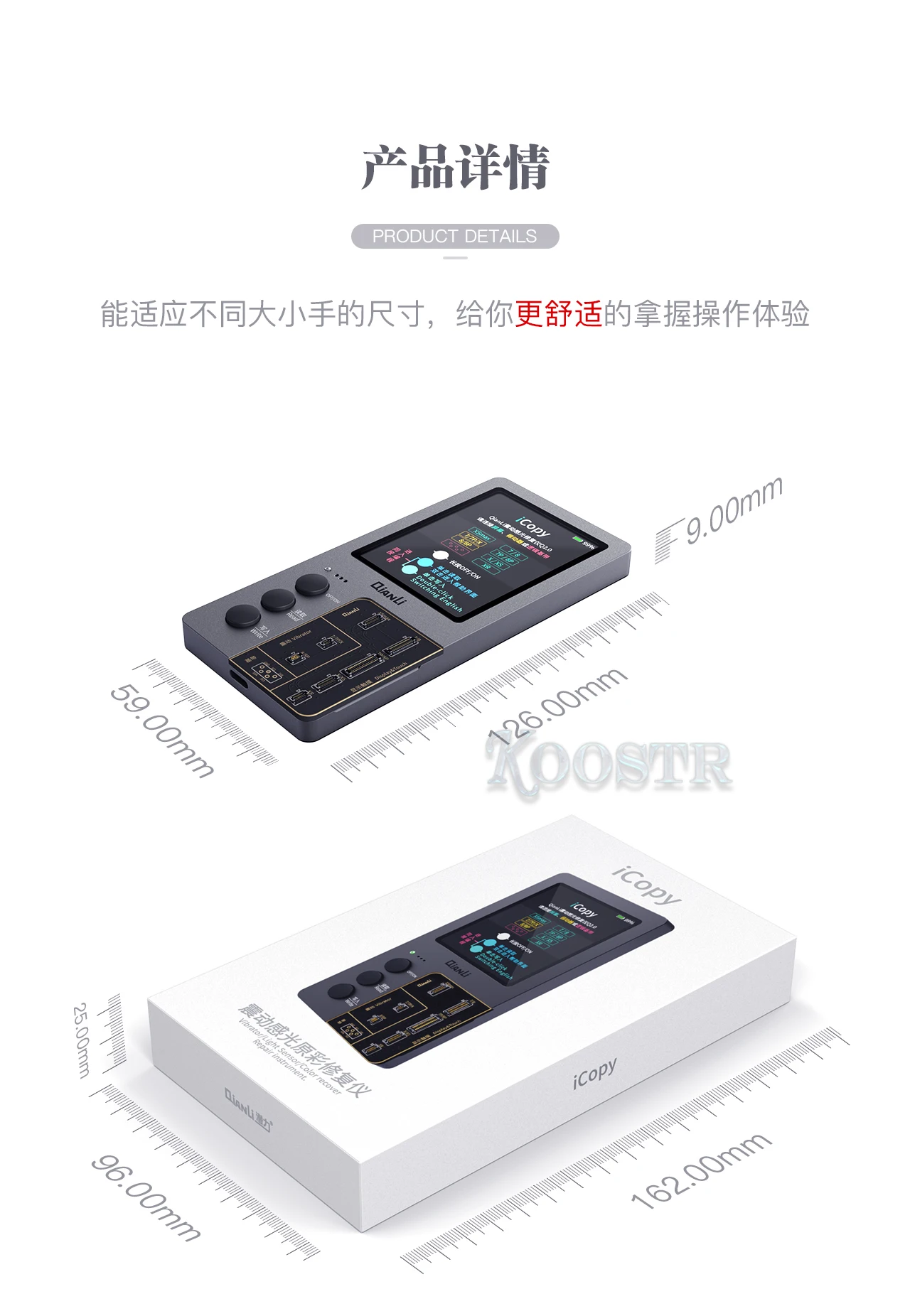 Функции 1. Reaing chips'data (дисплей истинного тона, вибратор, датчик на светильник, сенсорный датчик, логическая доска, базовый браслет) и перезапись в новый ЖК-дисплей; 2. Ремонт функции истинного тона для iPhone 8 выше; 3. Поддержка НЕОРИГИНАЛЬНОГО экрана; 4. Независимое R & D программное обеспечение для записи и сохранения данных; 5. Доступны для тестирования и изменения данных о батарее, четкого цикла работы батареи и эффективного изменения батареи (требуется плата соединителя батареи); 6. Доступны для тестирования и изменения данных кабеля/головных уборов данных, восстановления кабеля данных/головного убора 'обычные функции. (Кабели для передачи данных/плата разъема гарнитуры). Многоязычный пользовательский интерфейс iCopy Plus (2-я версия) поддерживает английский, испанский и китайский языки Посылка: Посылка 1:1 шт. гарнитура; Посылка 2:1 шт. iCopy Plus Основное устройство; Посылка 3: 1 шт. дисплей/вибратор доска; Посылка 4:1 шт. iCopy Plus Основное устройство;1 шт. дисплей/вибратор доска;1 шт. плата батареи;1 шт. плата для гарнитуры